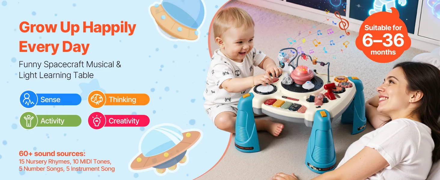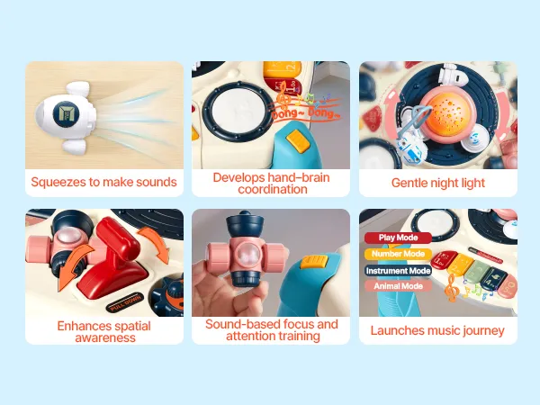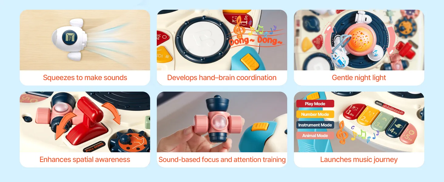 Dieser Aktivitätstisch für Kleinkinder bietet 10 Lieder, 10 MIDI-Effekte, einen Zahlenmodus und 4 Klaviermodi. Kinder können eine abnehmbare Raumschiffpfeife, ein Quetschschiff, Perkussionsknöpfe, ein Perlenlabyrinth und Zahnräder bedienen.