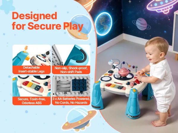 • Stabile & kinderfreundliche Konstruktion: Dieser Weltraum-Aktivitätstisch verfügt über verstärkte, einrastbare Beine und rutschfeste Füße für sicheren Stand. Die robuste ABS-Konstruktion sorgt für Stabilität. Der Tisch wird mit 3 AA-Batterien (nicht im Lieferumfang enthalten) betrieben und bleibt so ordentlich und kabellos
