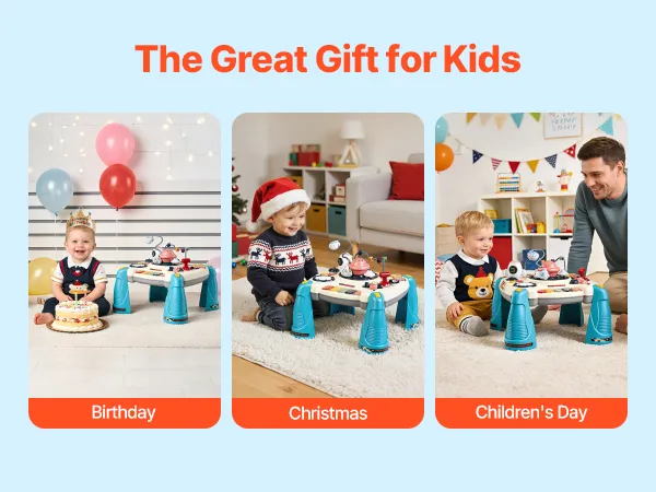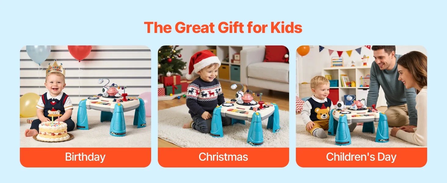 Dieser Lerntisch für Kleinkinder lädt Kinder dazu ein, eigene Geräusche und Rhythmen zu erzeugen. Kreatives Spielen hilft Kindern, Gefühle auszudrücken, Geschichten zu entwickeln und alltägliche Momente in freudige Erinnerungen zu verwandeln.