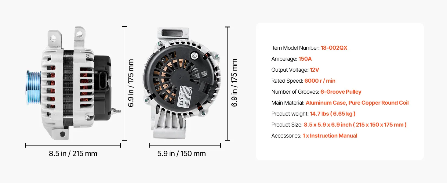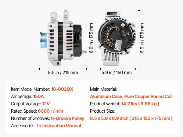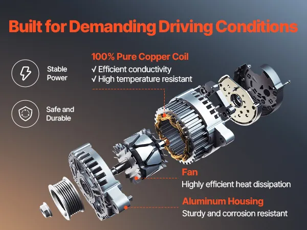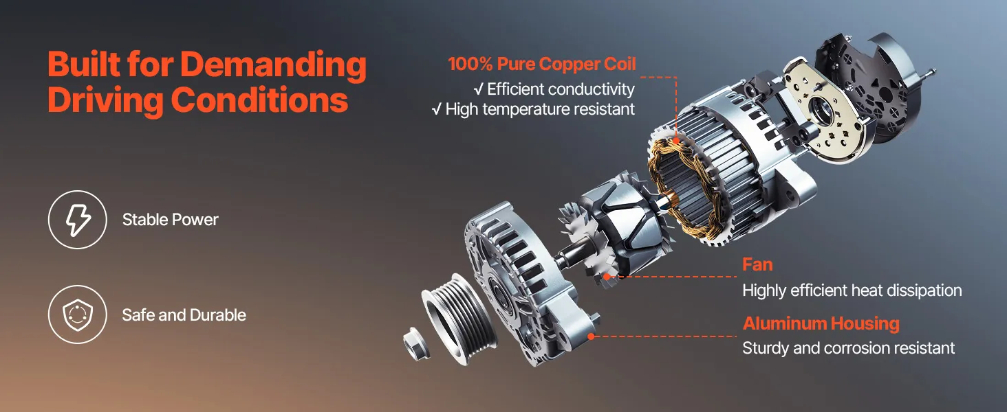 Unser Ersatzgenerator verfügt über Spulen aus reinem Kupfer für eine längere Lebensdauer als Aluminium. Das Aluminiumgehäuse und der Lüfter verbessern die Wärmeableitung. Er liefert eine stabile Ausgangsleistung von 150 A zur Unterstützung hochbelasteter Geräte wie Klimaanlagen und hochwertiger Soundsysteme.