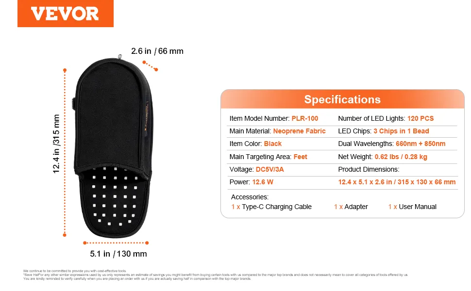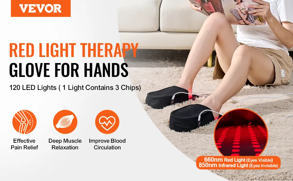 Mit Wellenlängen von 660 nm und 850 nm, 120 LEDs und 360 Chips sowie 10 Hz/40 Hz-Puls beleuchtet der VEVOR-Rotlichttherapieschuh den gesamten Fuß und liefert hochintensives Licht, um die Muskeln effektiv zu entspannen und die Durchblutung zu fördern.
