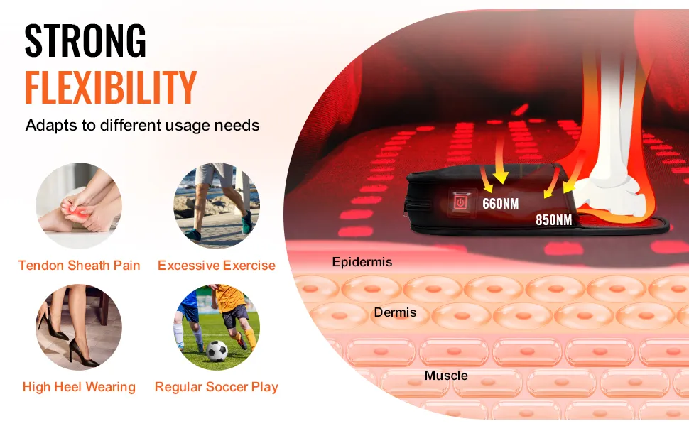 Entdecken Sie die Vorteile der zwei Wellenlängen 660 nm und 850 nm. Egal, ob Sie Sehnenscheidenschmerzen durch übermäßiges Training oder Unbehagen durch das Tragen von High Heels heilen möchten, dieses Therapiegerät bietet wirksame Linderung und Entspannung.