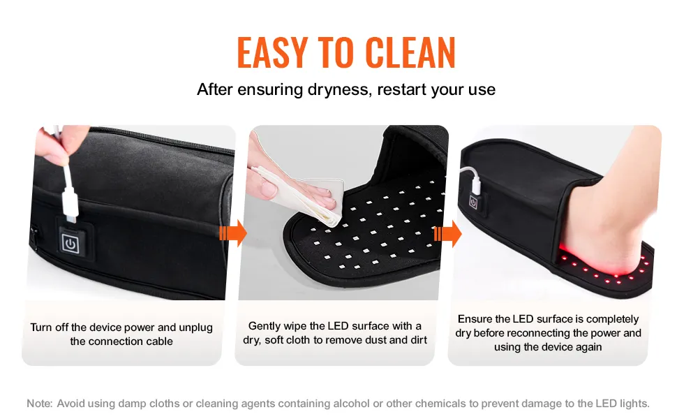 Effektive Schmerzlinderung: Die VEVOR-Rotlichttherapie-Pantoffeln sind mit 120 LED-Leuchten und 360 Chips ausgestattet (jede Leuchte enthält 3 Chips). Sie können den gesamten Fuß, die Sohle, die Zehenspitzen, die Zehen und den Spann umschließen und bieten eine Strahlung von 20 mW/c㎡, um Schmerzen zu lindern, Muskeln zu entspannen und die Durchblutung zu fördern.