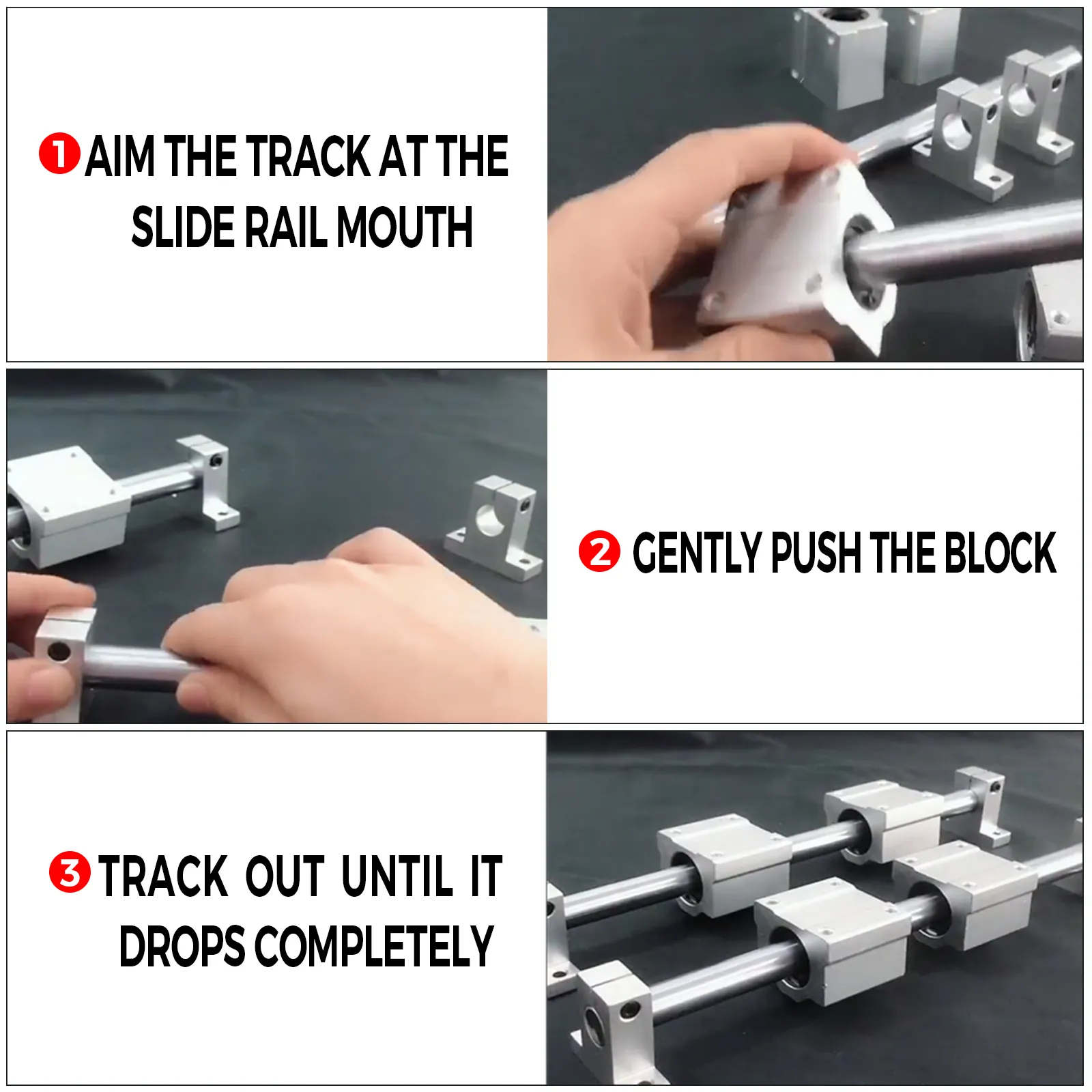 Die Gleitblöcke werden gemeinsam mit Schienen eingesetzt. Das innere Linearlager sorgt für ein sanftes Gleiten. Stangenschienenwellenhalterung mit hoher Genauigkeit (G6).