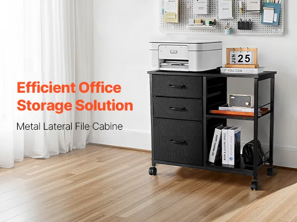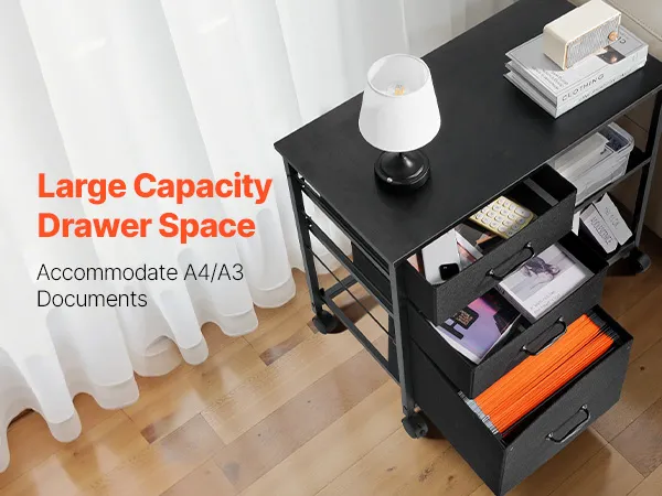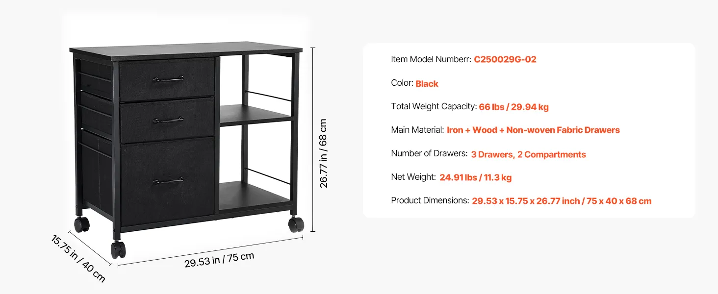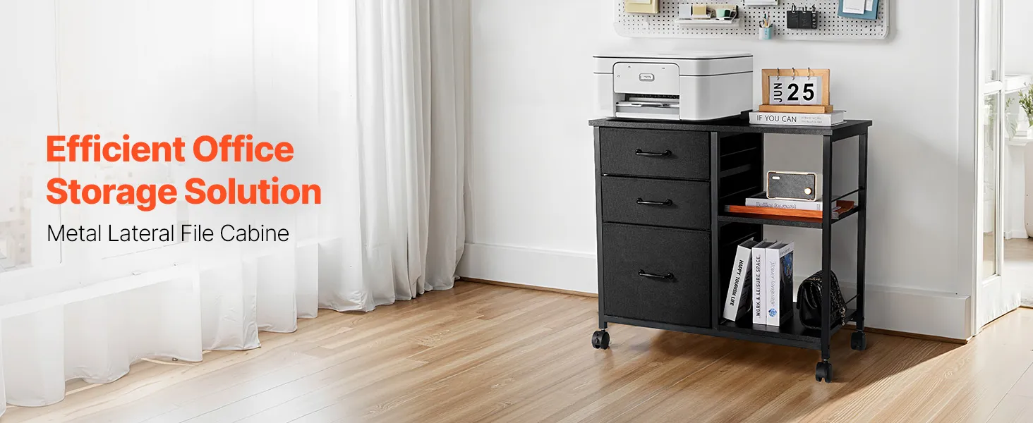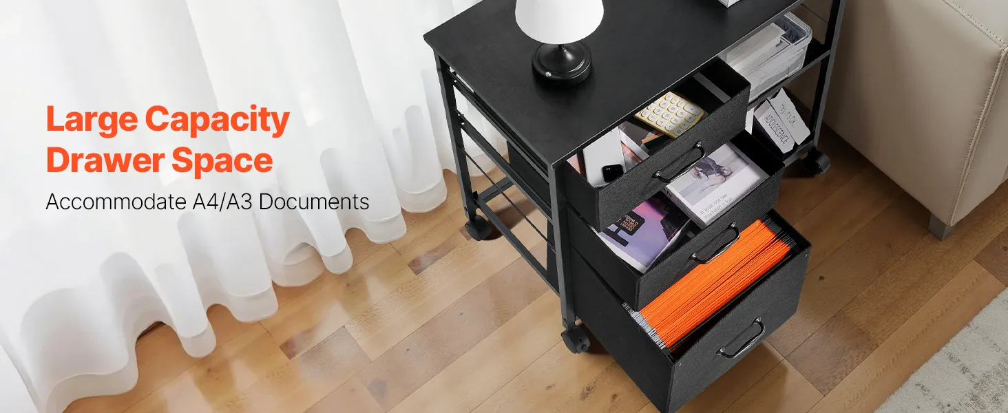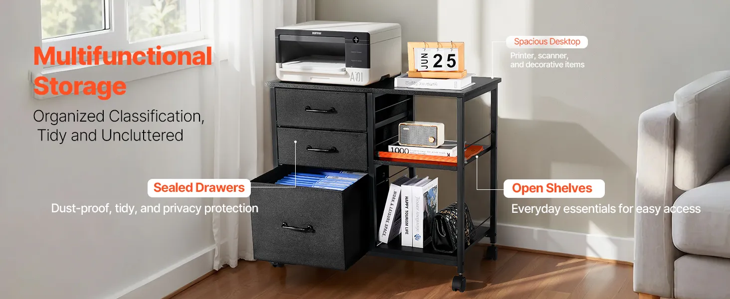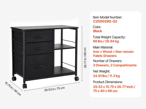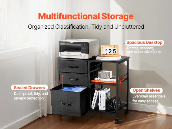 VEVOR Aktenschrank Schubladenschrank mit 3 Stoffschubladen, Rollcontainer mit 2 offenen Regalen, Lagerschrank Aufbewahrungsschrank für Schreibwaren Drucker Dokumente (Schwarz, 75 x 40 x 68 cm)