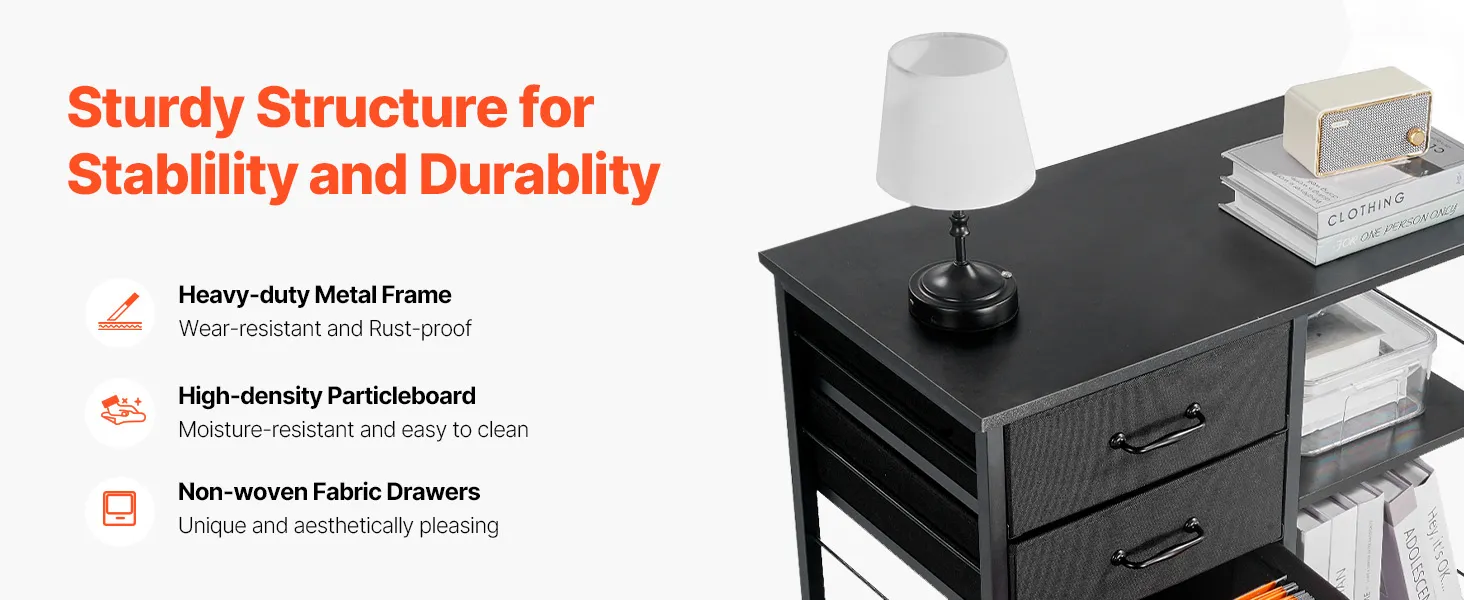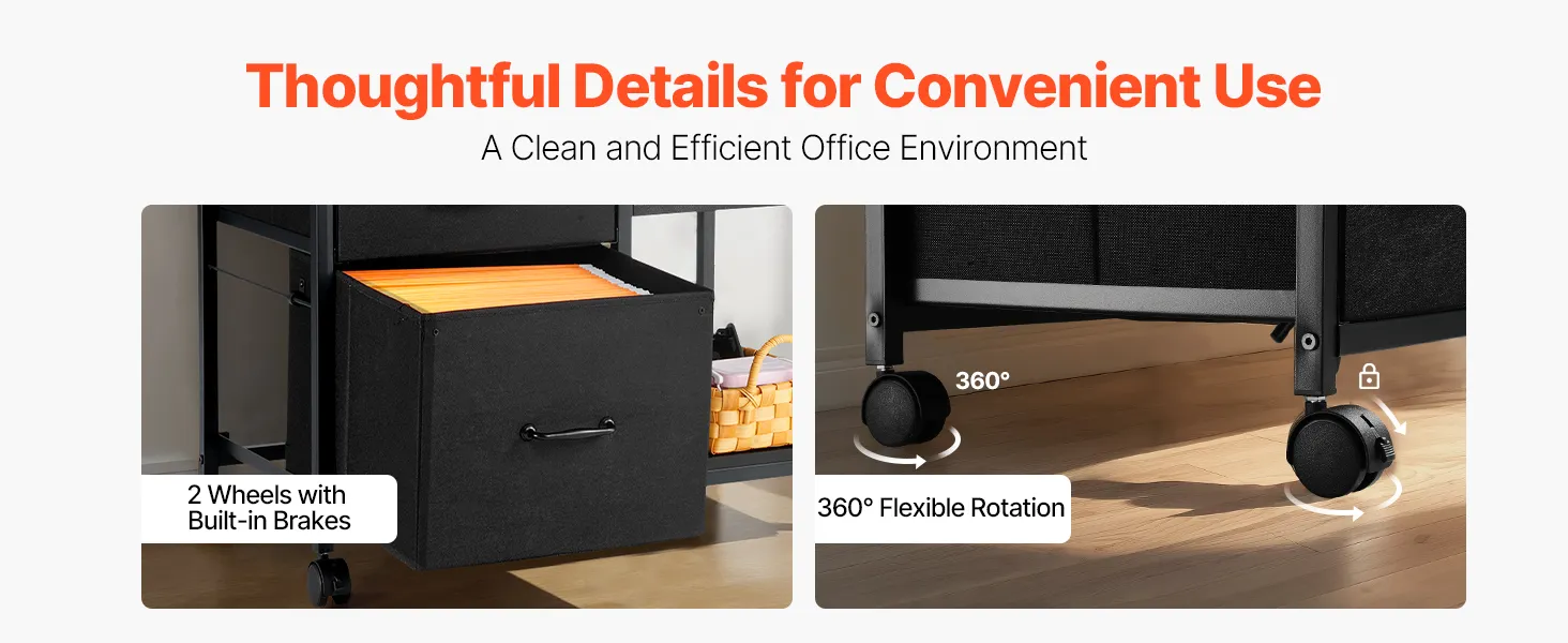 Der Aktenschrank ist robust und verfügt über einen soliden Metallrahmen, der festen Halt bietet. Die Holzplatte ist verschleißfest und leicht zu reinigen, und die Schubladen aus Vliesstoff sind sowohl attraktiv als auch praktisch.