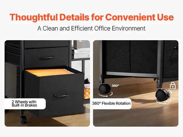 Leicht zu bewegen: Der Schrank ist mit vier Lenkrollen ausgestattet, sodass Sie ihn auch mit voller Aktenbeladung problemlos an jeden beliebigen Ort bewegen können. Zwei der Rollen verfügen über einen Feststellmechanismus, sodass Sie den Schrank nach dem Bewegen sicher an seinem Platz fixieren und so für Stabilität sorgen können