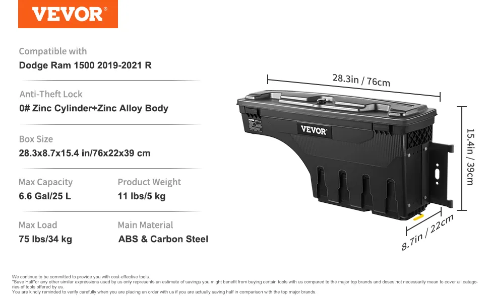 Der VEVOR-Radkasten-Werkzeugkasten ist so konzipiert, dass er den Platz in der Ladefläche eines Lkws optimal nutzt. Er benötigt also weniger Platz zum Unterbringen. Allerdings kann dieser Aufbewahrungskasten problemlos bis zu 75 Pfund Ausrüstung aufnehmen. Er bietet also eine beträchtliche Menge zusätzlichen Stauraum, ohne die Funktionalität der Ladefläche zu beeinträchtigen. Darüber hinaus hat dieser schwarze Lkw-Werkzeugkasten ein Fassungsvermögen von 6,6 Gallonen (25 Liter).