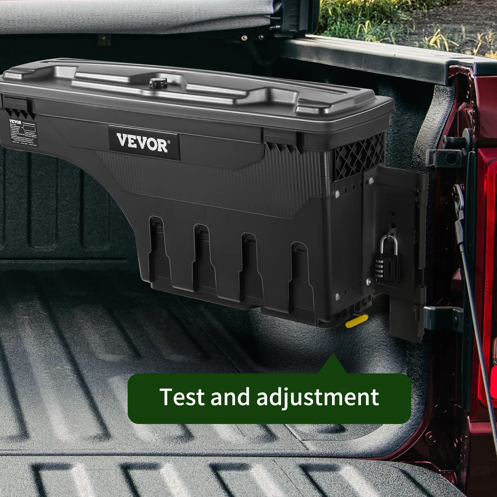 Die Installation der VEVOR-Ladeflächen-Aufbewahrungsbox ist ganz einfach. Markieren Sie im ersten Schritt die Stelle, an der Sie diese Aufbewahrungsbox installieren möchten. Bohren Sie nun an den markierten Stellen Löcher in Ihre Ladefläche. Platzieren Sie die Halterung auf den gebohrten Löchern und stellen Sie sicher, dass sie richtig ausgerichtet sind.