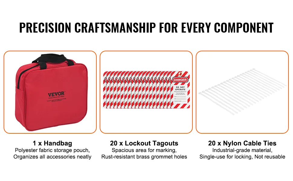 Unser Maschinenverriegelungsset ist einfach und leicht zu verwenden. Wir haben die Artikel klar beschriftet und organisiert. So ist es für jeden einfach, ihren Zweck und ihre ordnungsgemäße Verwendung zu erkennen. Die Tasche, Schlösser und Bänder sind für verschiedene Zwecke nützlich, beispielsweise zum Sichern von Toren, Schildern und anderen Bereichen, die eingeschränkten Zugang erfordern.