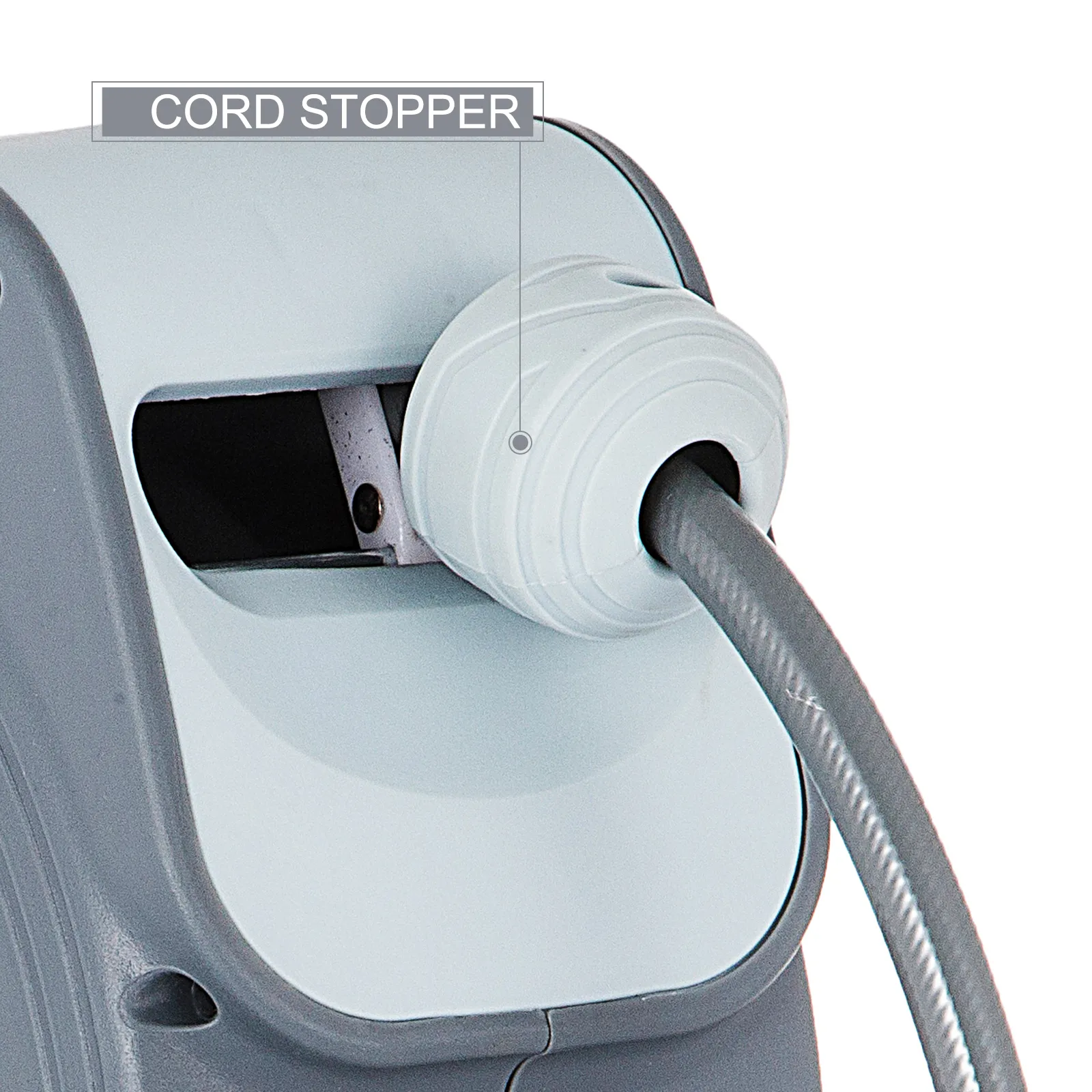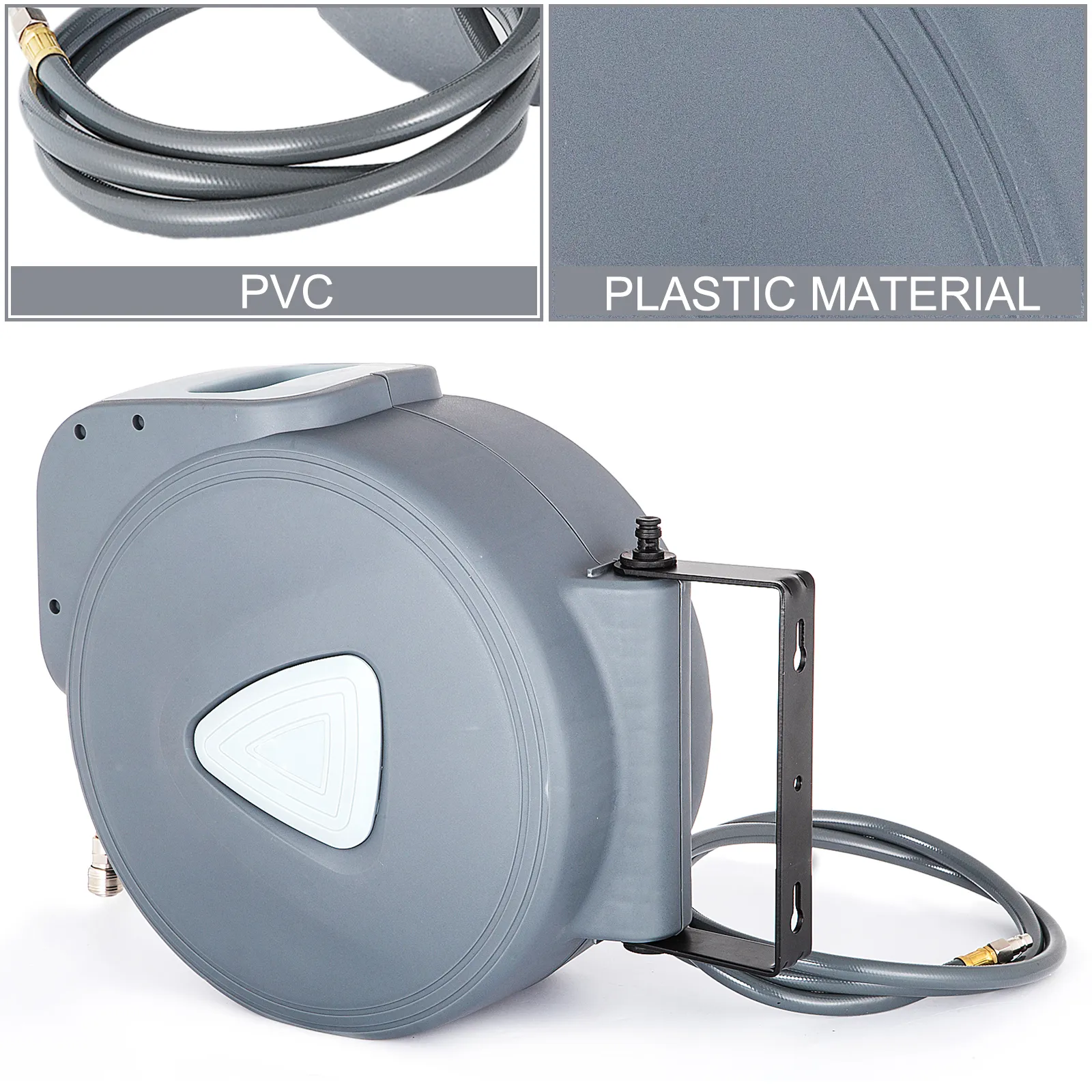Mit einer Kunststoffschale hält diese einziehbare Wasserschlauchtrommel hohen Temperaturen stand und zwar langlebig. Der Schlauch ist 30 m lang und kann sich innerhalb des Kontrollbereichs frei bewegen. Eine automatische Verriegelung im Gehäuse steuert die Länge des Schlauchs, der herausgezogen und zurückgezogen wird. Der Kabelstopper wurde übernommen, um die Größe der Rohrleitung zu steuern und zu schützen. Durch eine Selbstschichtungsfunktion wird der Schlauch sauber und gleichmäßig in das Gehäuse gewickelt. Die Box ist um 180° schwenkbar und zur Wandmontage geeignet für Werkswerkstätten, Autowartung und andere Orte.