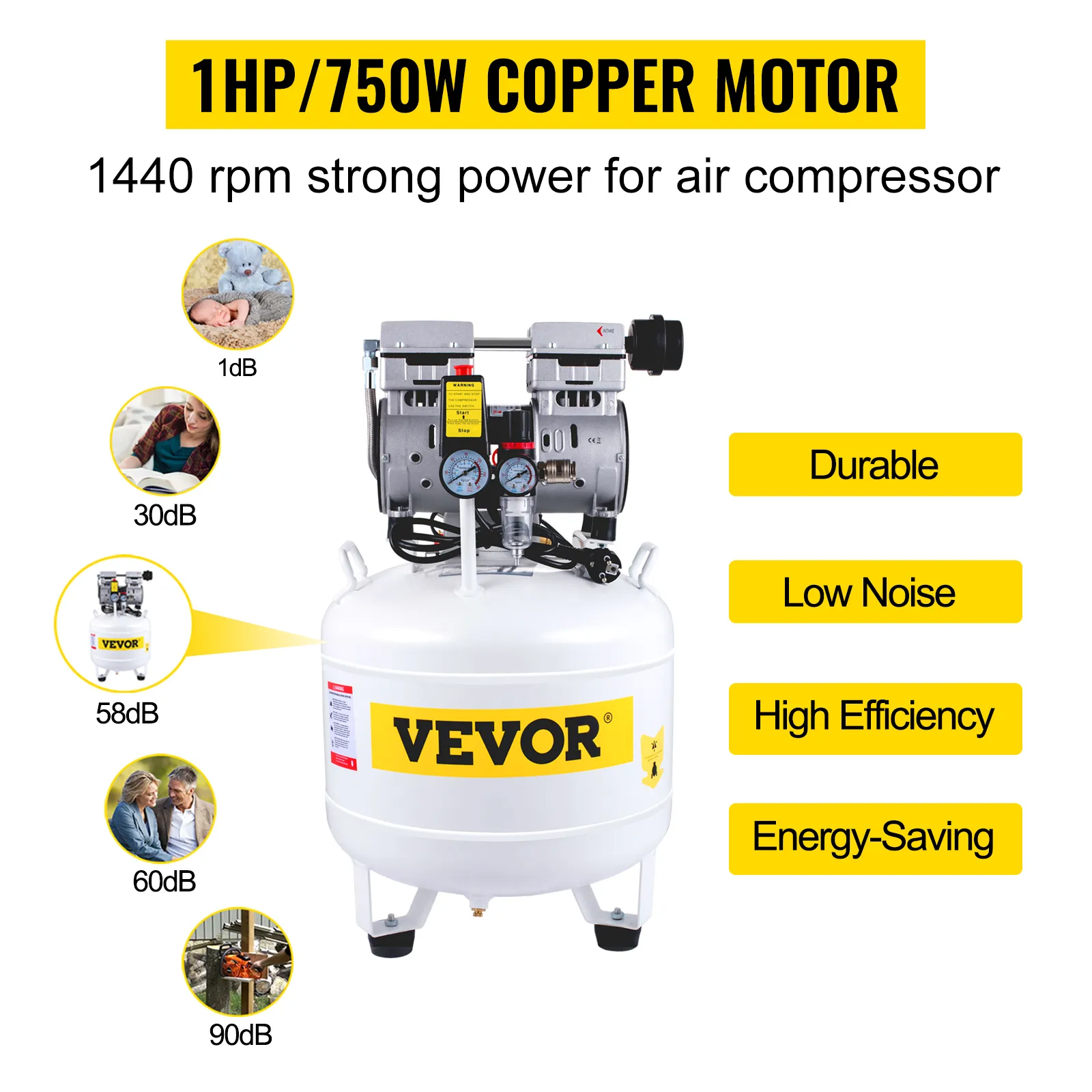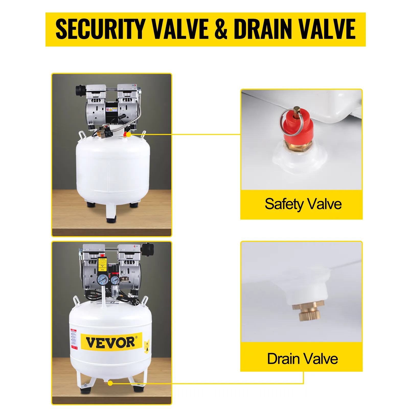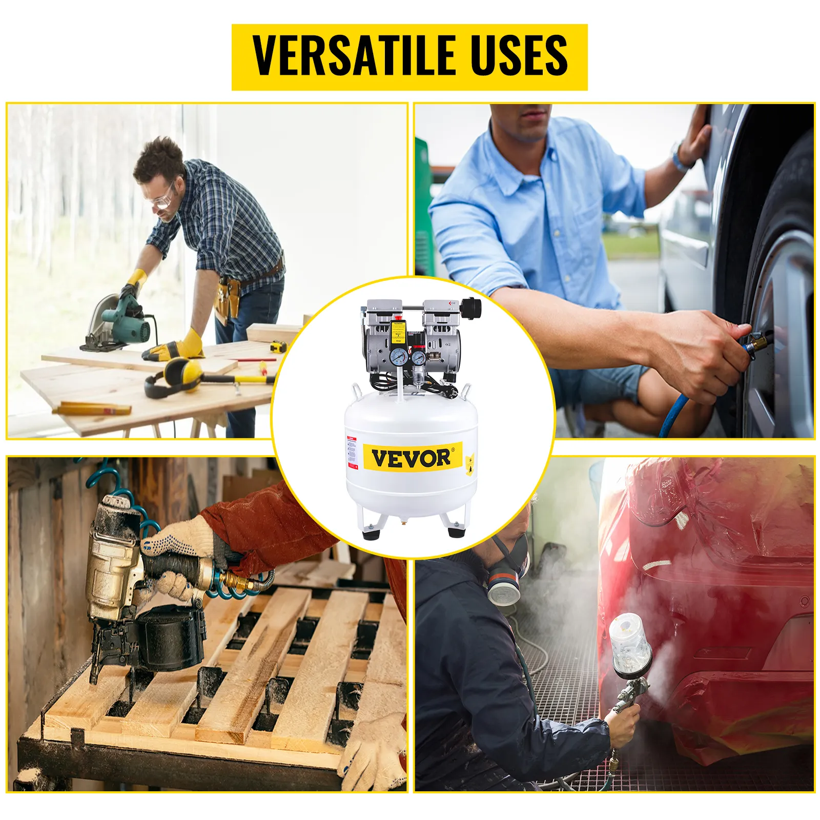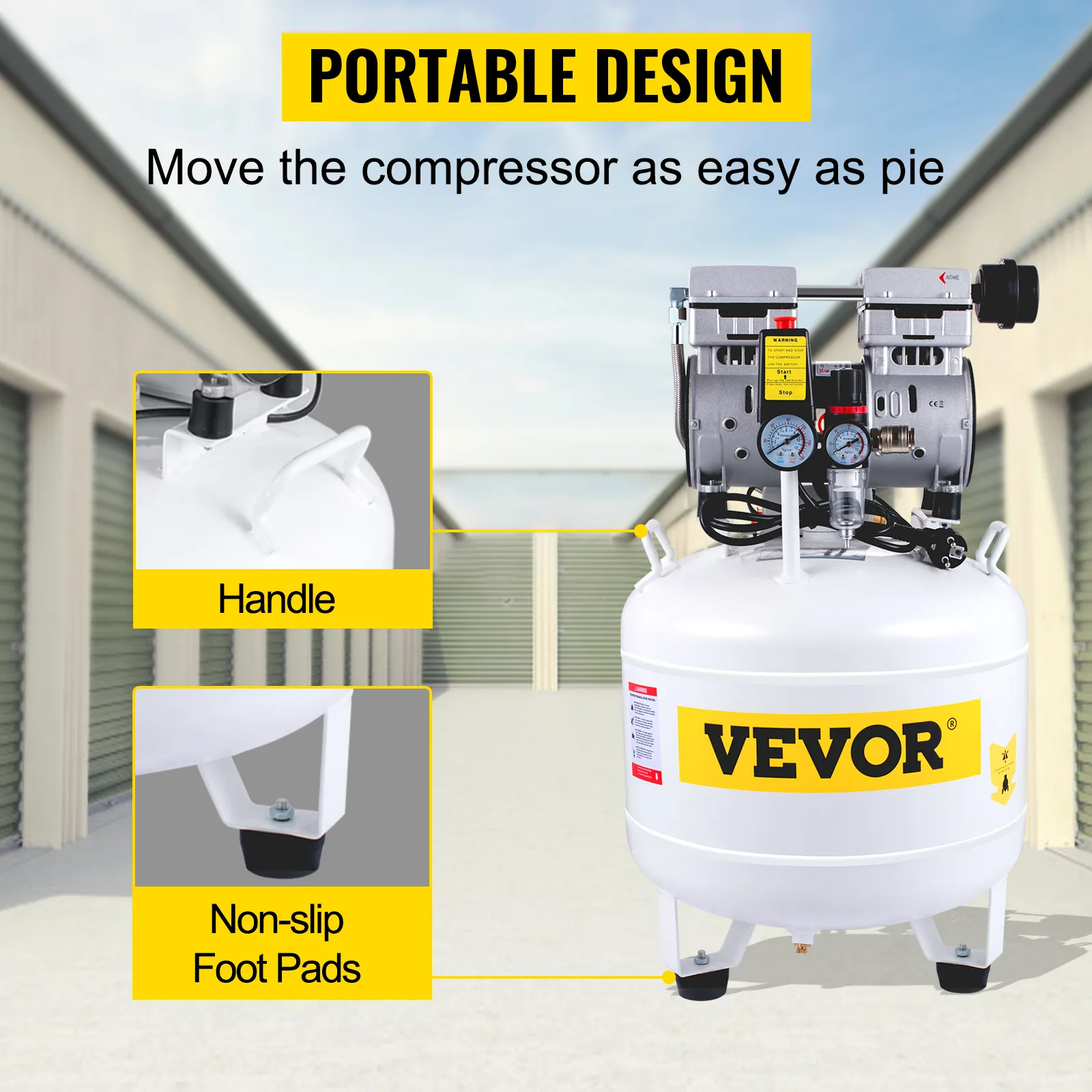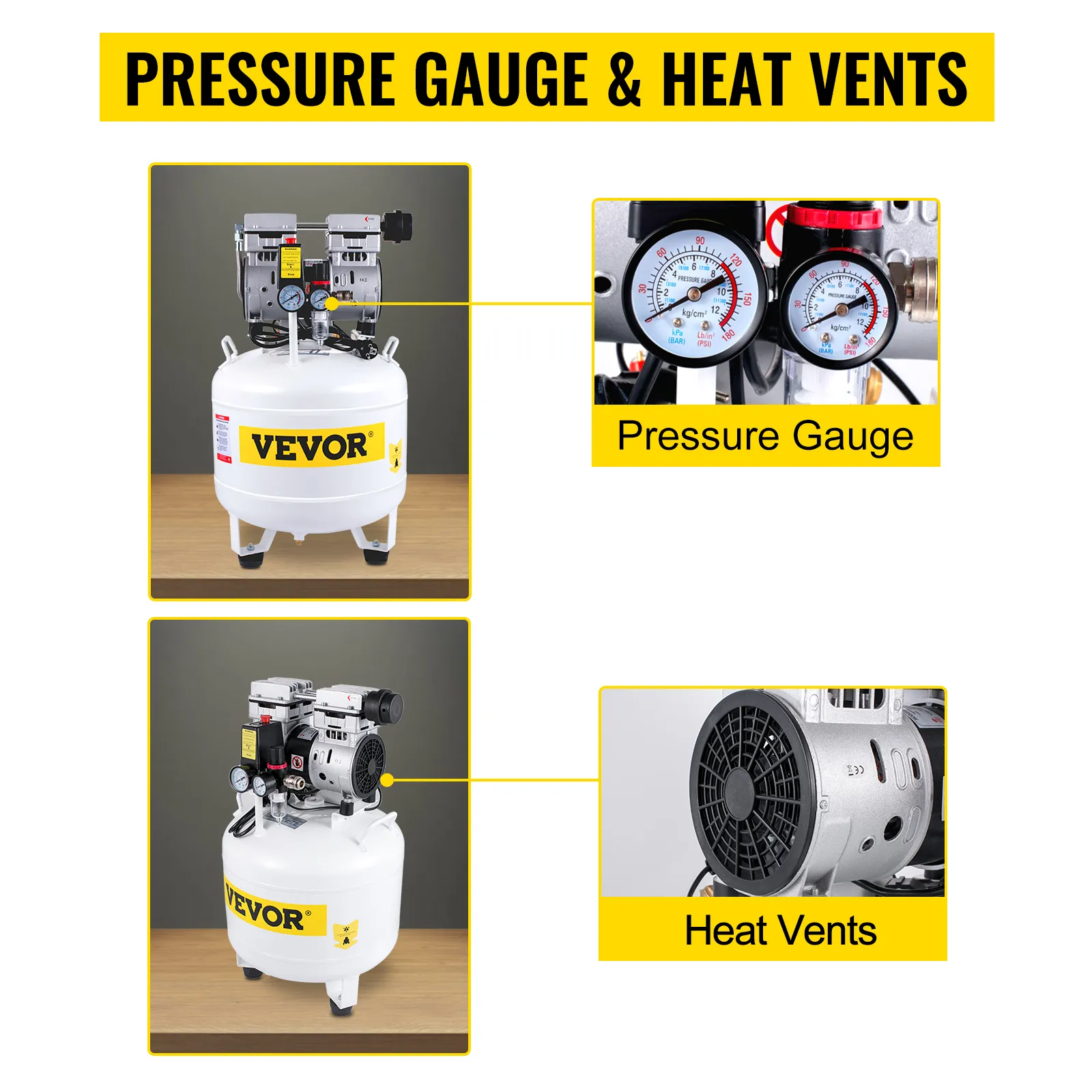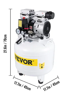 Der ölfreie Leiselauf-Kompressor eignet sich für Reparaturen zu Hause, zum Aufpumpen von Reifen, zur Fahrzeugreinigung, für die Zahnmedizin usw. Er unterstützt den Nagler, die Abdichtungspistole, die Bohrmaschine, die Spritzpistole und andere Arten von Druckluftwerkzeugen.