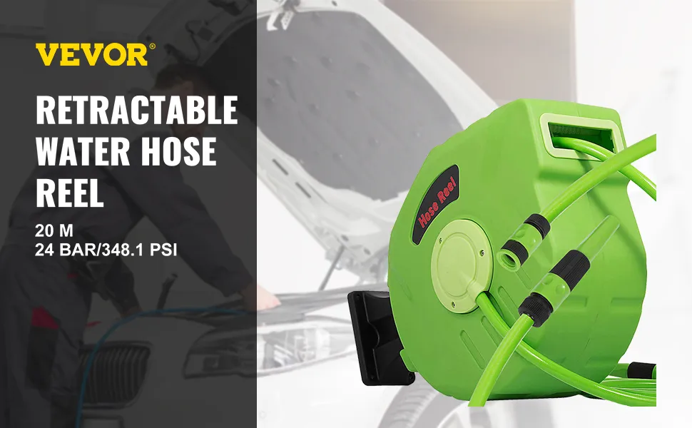 Mit einer Kunststoffschale hält diese einziehbare Wasserschlauchtrommel hohen Temperaturen stand und zwar langlebig. Der Schlauch ist 20 m lang und kann sich innerhalb des Kontrollbereichs frei bewegen. Eine automatische Verriegelung im Gehäuse steuert die Länge des Schlauchs, der herausgezogen und zurückgezogen wird. Der Kabelstopper wurde übernommen, um die Größe der Rohrleitung zu steuern und zu schützen. Durch eine Selbstschichtungsfunktion wird der Schlauch sauber und gleichmäßig in das Gehäuse gewickelt. Die Box ist um 180° schwenkbar und zur Wandmontage geeignet für Werkswerkstätten, Autowartung und andere Orte.