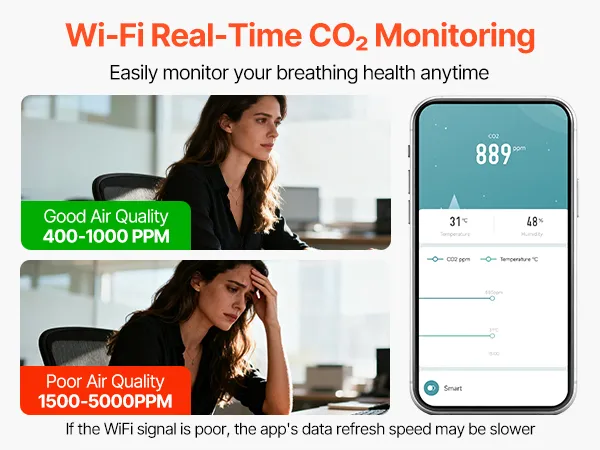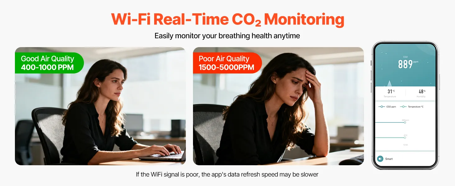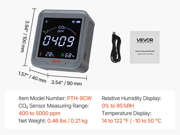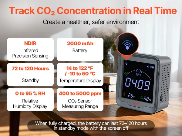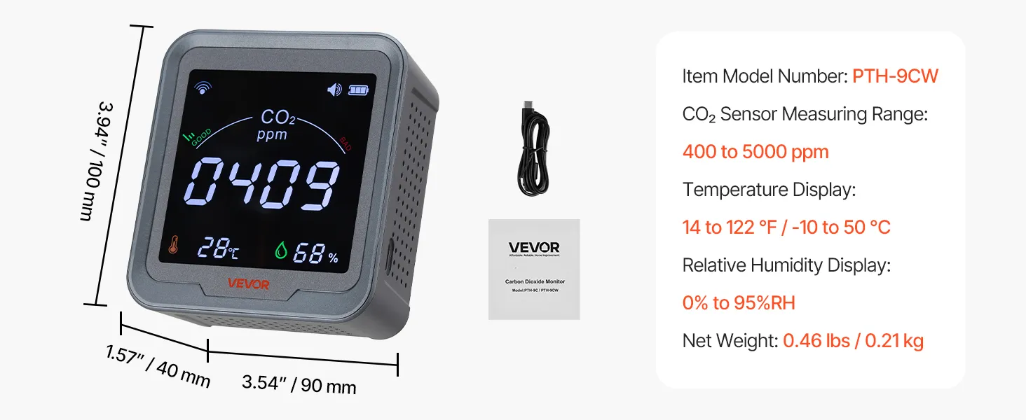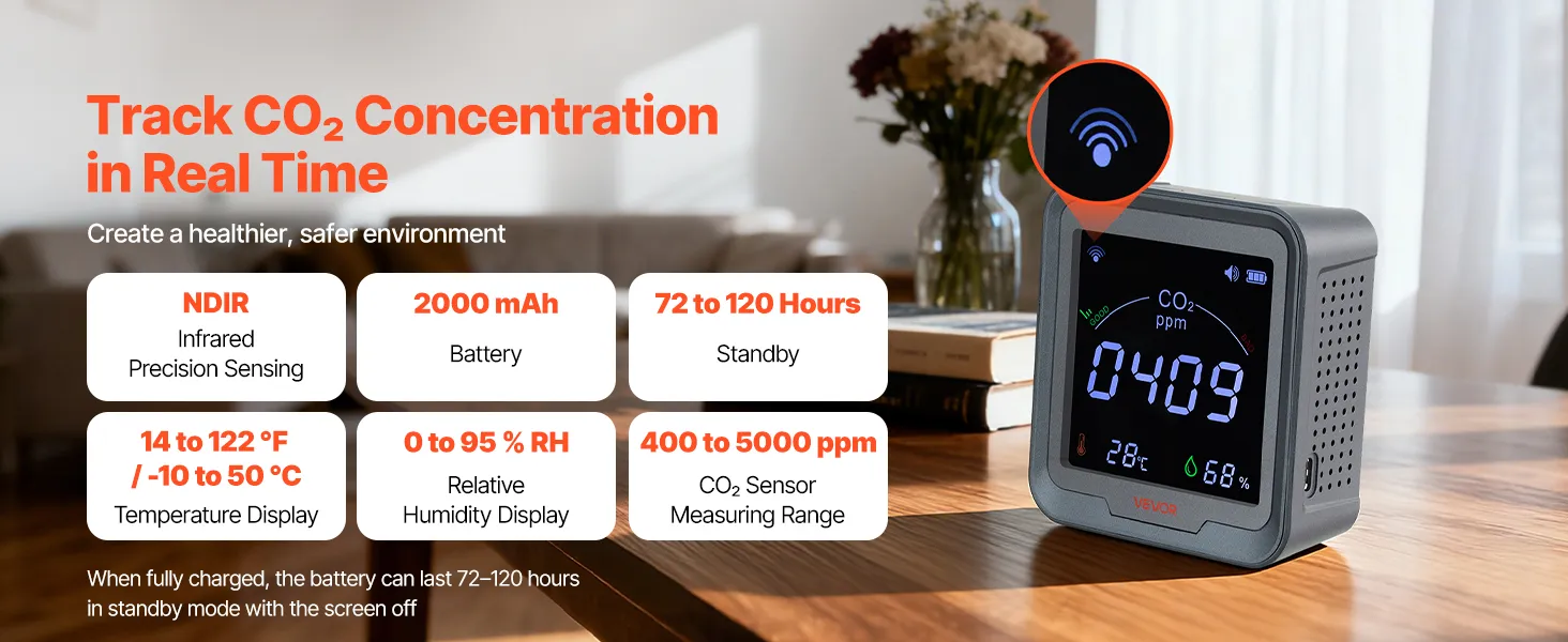 Dieser VEVOR CO2-Monitor verfügt über ein dreifarbiges Hintergrundbeleuchtungssystem: Grün (400–700 ppm), Gelb (700–1500 ppm) und Rot (1500–5000 ppm) und liefert Echtzeit-Feedback zur Luftqualität. Er warnt den Benutzer sofort vor CO₂-Werten, hilft bei der Anpassung der Belüftung und unterstützt eine gesündere Atmung in Innenräumen.