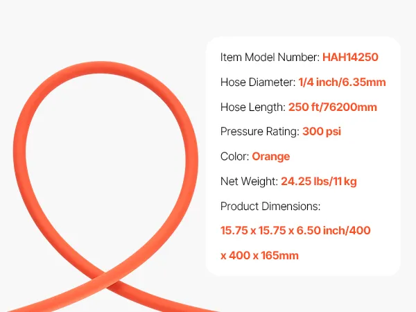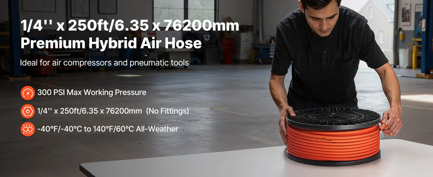 VEVOR Druckluftschlauch, 6,35 mm x 76,2 m Hybrid-Luftschlauch, pneumatische Schläuche mit dreischichtigem Hybridmaterial für Auto, Haus & Gebäude, 20,6 bar, Allwetter-Flexibilität, Orange