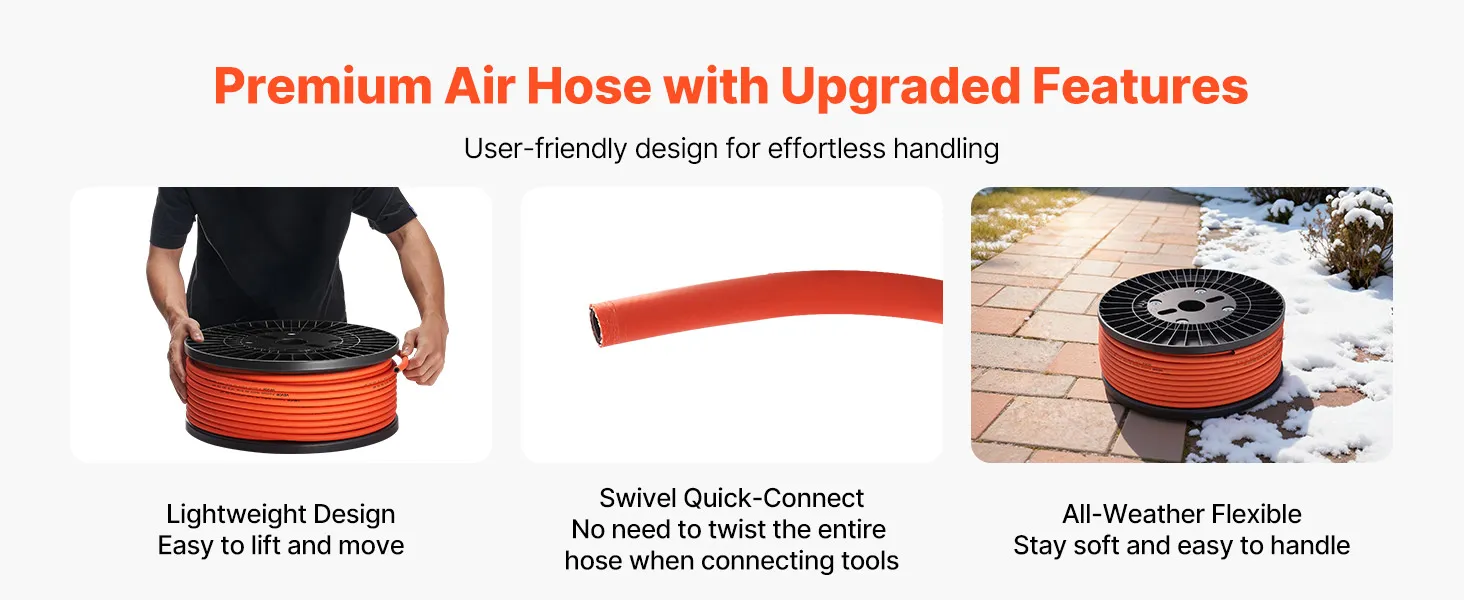 Der hochflexible, verbindungslose Druckluftschlauch besteht aus einem Hybridmaterial aus Gummi und PVC und lässt sich flexibel auf die benötigte Länge kürzen, um individuellen Installationsanforderungen gerecht zu werden. Er eignet sich für Heimwerker, Geräteintegratoren und Rohrleitungen für spezielle Szenarien, spart Kosten und bietet mehr Flexibilität.