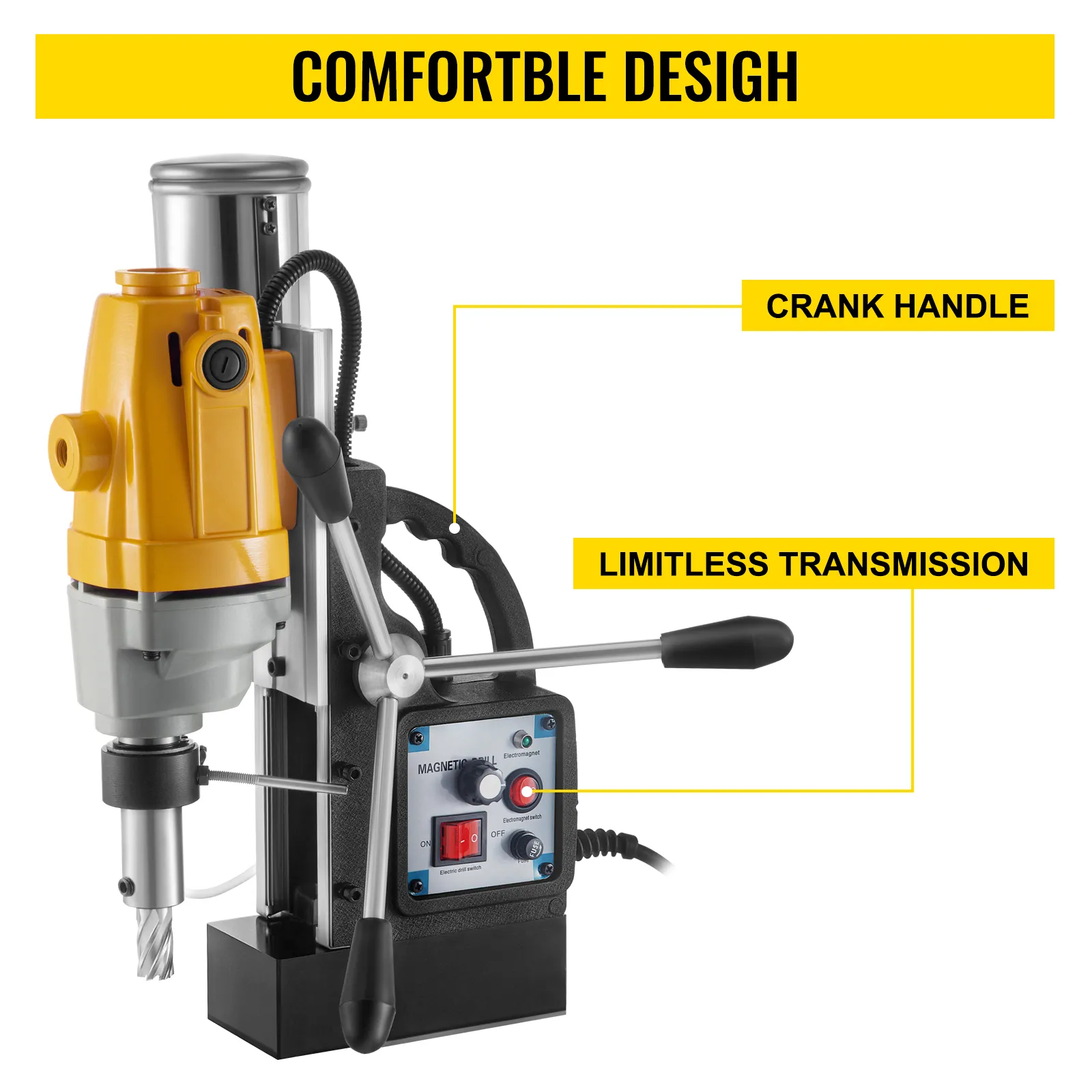 Das Design des Griffs unserer Magnetbohrmaschine erleichtert Ihnen die Arbeit und den Transport. Wenn Sie das Bedienfeld verwenden, erhalten Sie eine stufenlose Geschwindigkeitsregelung, solange Sie den Knopf drehen.