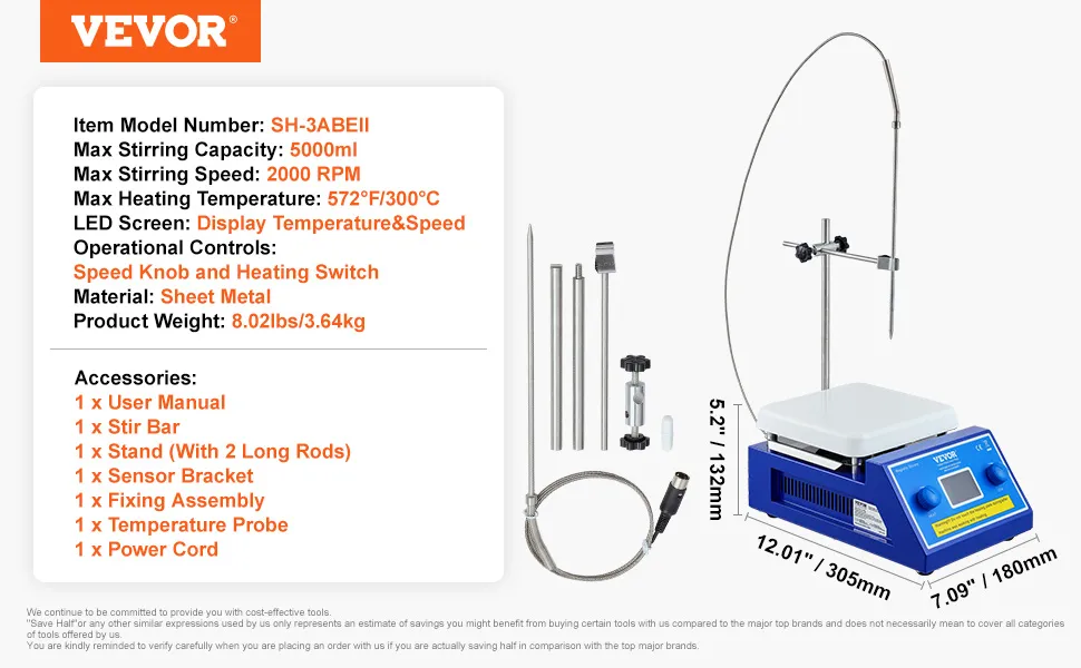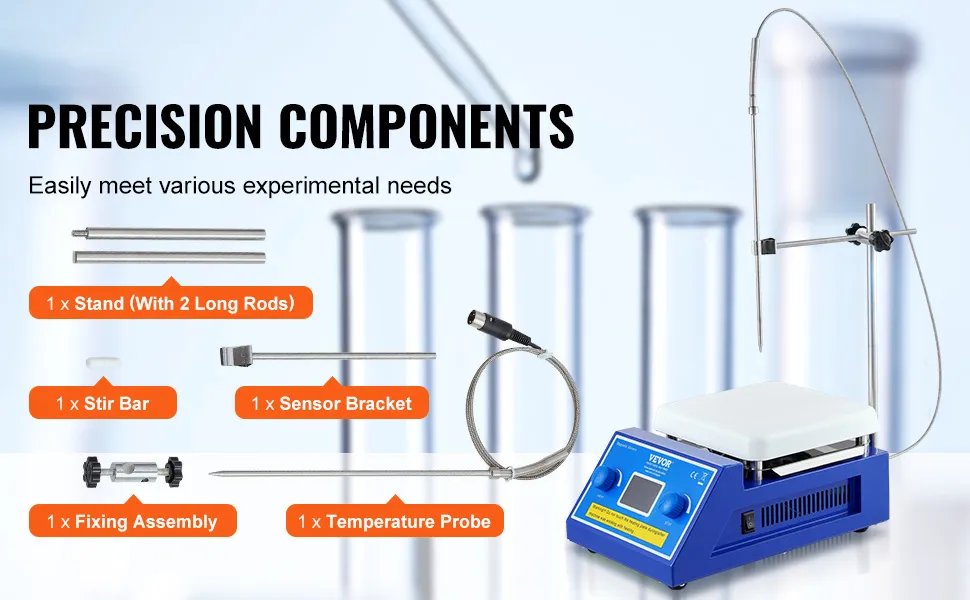 Die magnetische Rührplatte VEVOR wird mit einem kompletten Zubehörsatz geliefert, bestehend aus: 1 Bedienungsanleitung, 1 Rührstab, 1 Stativ, 1 Netzkabel, 1 Sensorhalterung, 1 Befestigungssatz, 1 Temperaturfühler, Herstellung Sie eignet sich für verschiedene Experimente.