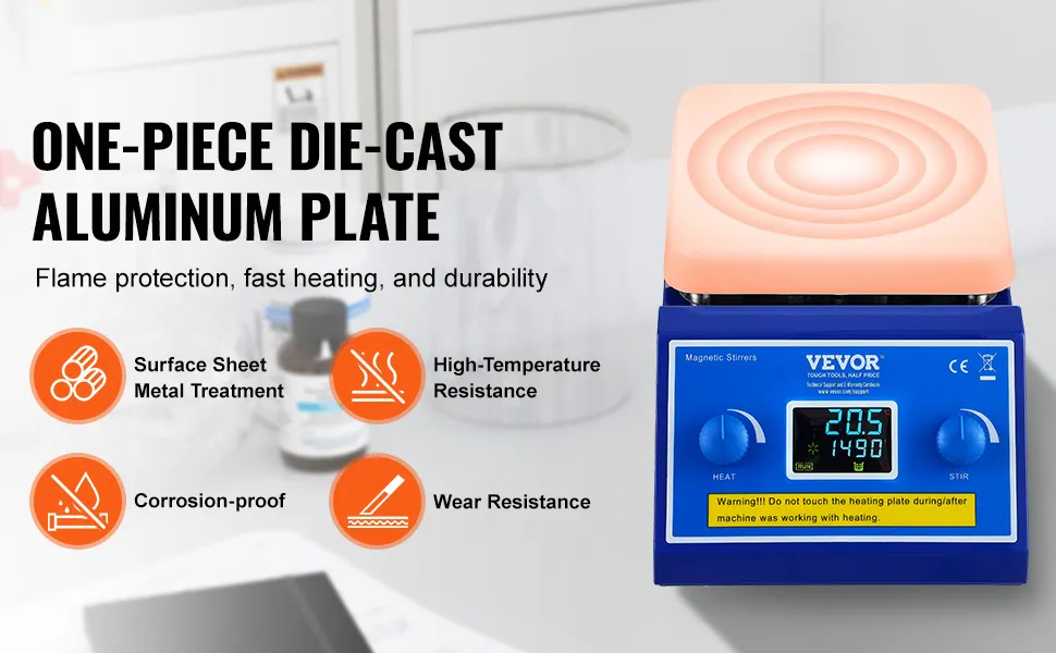 Hochwertige Materialien: Unser aus hochwertigen Materialien gefertigter Heizplattenrührer ist hitzebeständig, verschleiß- und korrosionsbeständig. Es bietet Flammschutz, schnelle Erwärmung und Haltbarkeit. Die Edelstahlplatte sorgt für eine schnelle und gleichmäßige Erwärmung und sorgt für eine hervorragende Rührleistung.