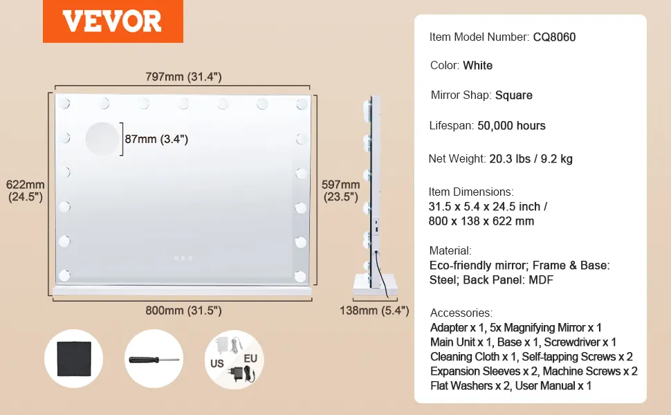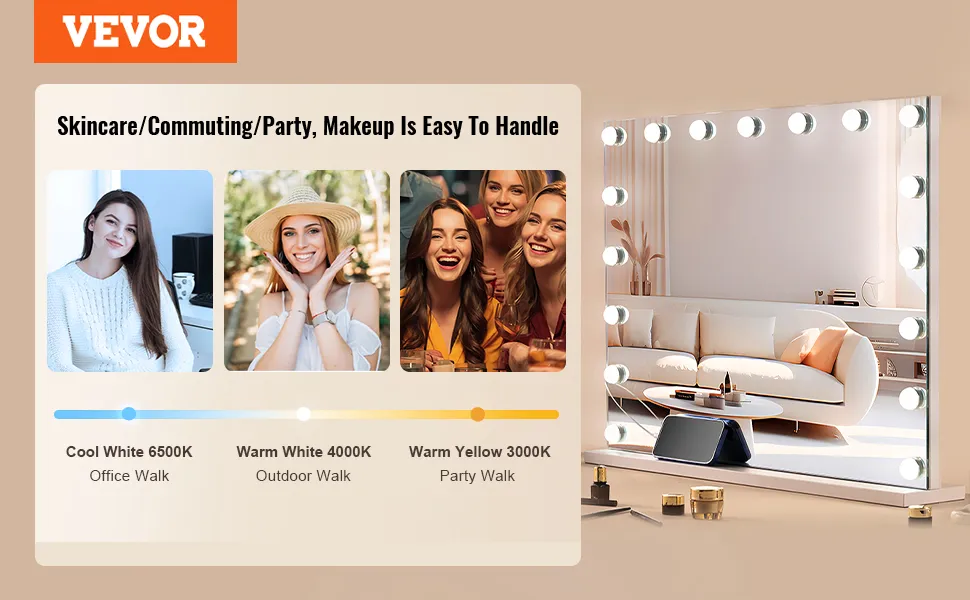 VEVOR Hollywood Schminkspiegel mit Beleuchtung, dimmbare Glühbirnen & 3 Farbbeleuchtungsmodi, Kosmetikspiegel mit abnehmbarer 5-facher Vergrößerung, USB, Typ C, Smart-Touch-Steuerung, 791x597mm