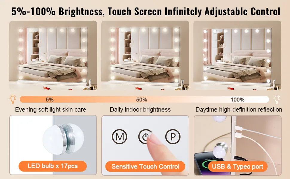 Berühren Sie einfach den Spiegel, um die Helligkeit des Spiegels anzupassen. Mehrere LED-Lampen beleuchten Ihre Schönheit gleichmäßig, 5 % - 100 % Helligkeit mit Ihrer präzisen Einstellung.
