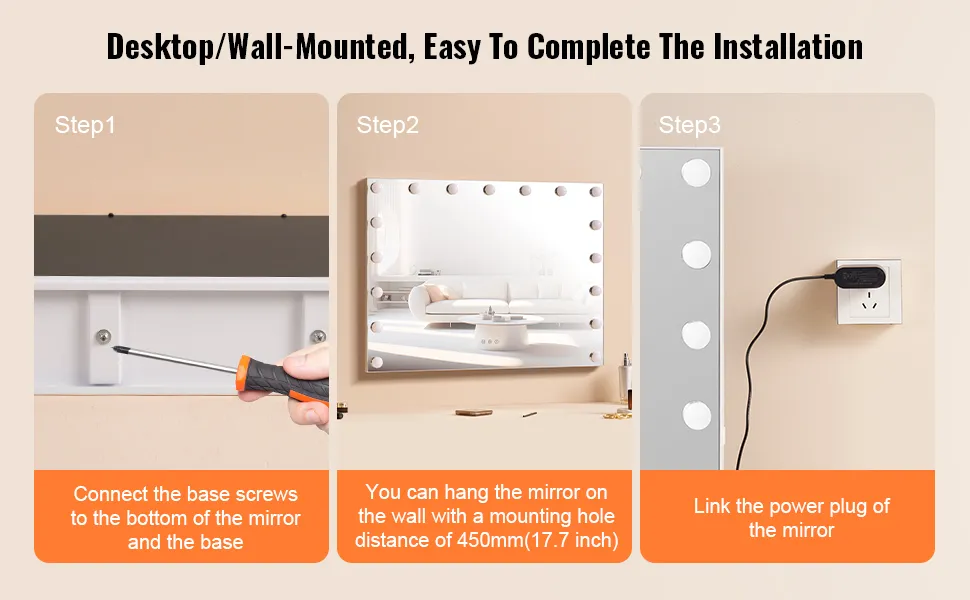 Wandmontage und Tischmontage: Wir unterstützen zwei Arten von Montagemethoden, je nach Bedarf: Montage auf der Arbeitsplatte des Kosmetikspiegels im Schlafzimmer oder an der Wand der Duschkabine.