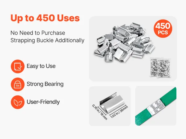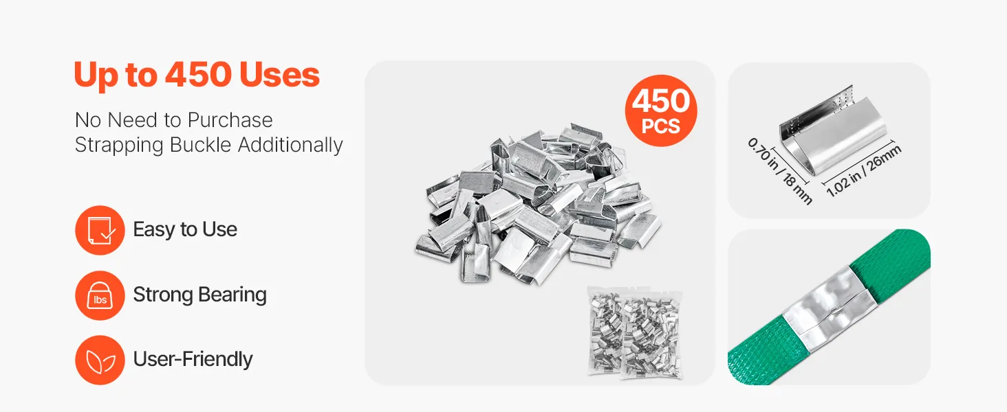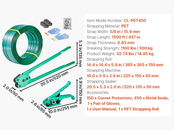Unser Umreifungsset enthält einen Umreifungsspanner, einen robusten Umreifungsverschluss, 450 Metallklammern, 150 Eckenschützer und eine Rolle PET-Umreifungsband. Das 457 m lange Band reicht aus – dieses komplette Set erfüllt alle Ihre täglichen Verpackungsanforderungen.