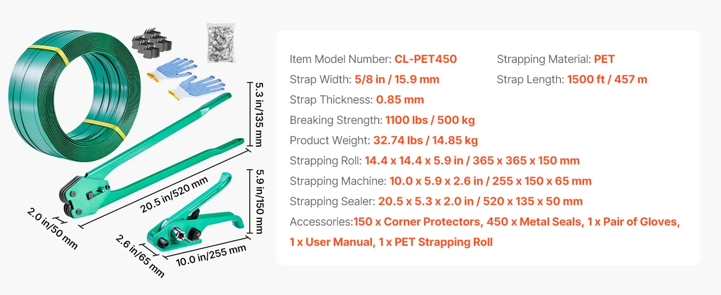 Komplettes Set im Lieferumfang enthalten: Das Palettenumreifungsset umfasst 1 Rolle schwarzes PET Umreifungsband (1500 Fuß / 457 m), 1 Bandsspanner, 1 Hochleistungs-Verschließzange, 450 Metallverschlüsse, 150 Eckenprotektoren sowie 1 Paar Handschuhe