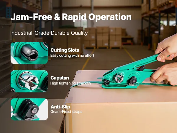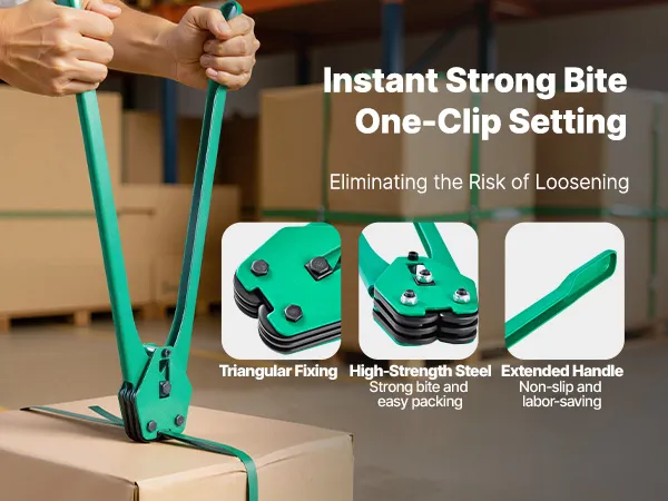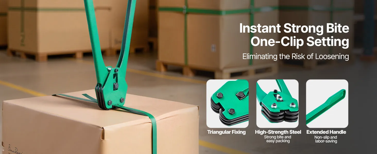 Manuelles Umreifungsgerät: Dieses robuste manuelle Umreifungsset ist mit einem verlängerten Griff ausgestattet. Es erhöht die Umreifungskraft durch kraftsparende Hebelbetätigung und ist für 15,9 mm breite Polyester-Umreifungsbänder (PET) geeignet