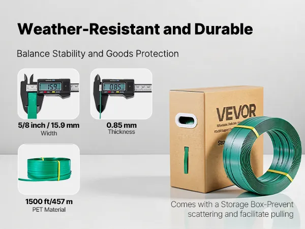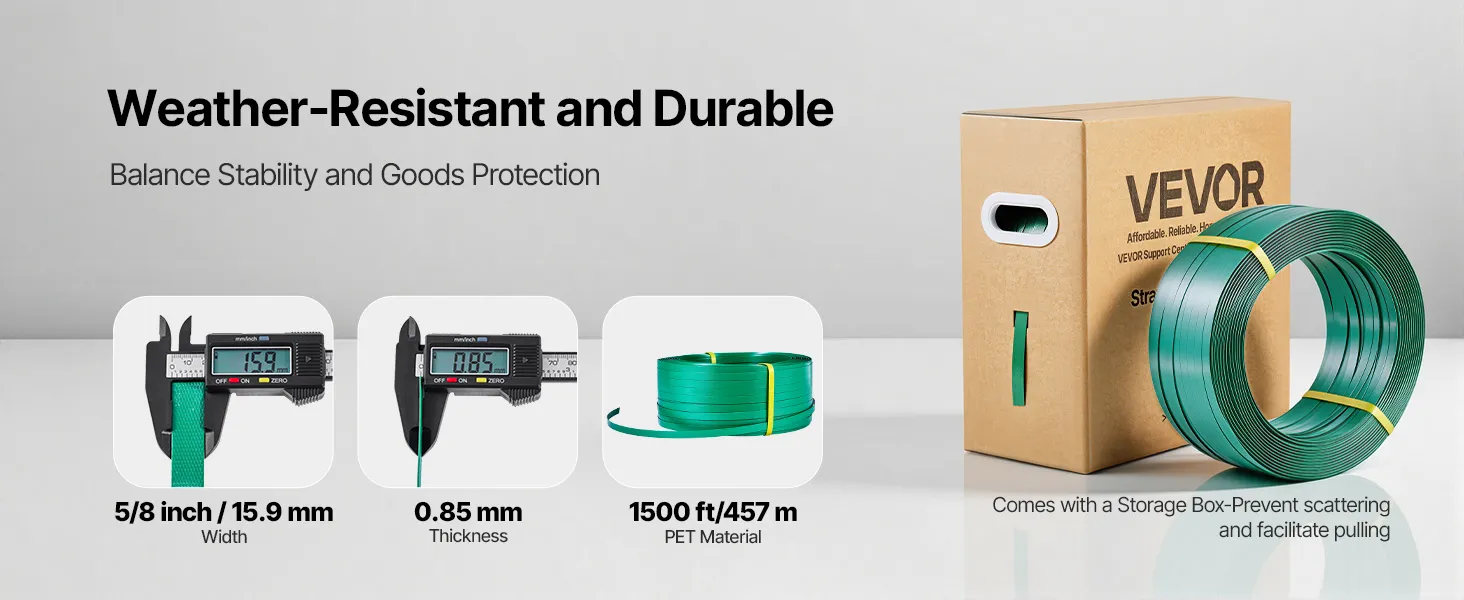 Hochwertiges PET Umreifungsband: Das Umreifungsset umfasst ein handelsübliches PET-Verpackungsband mit grüner geprägter Oberfläche. Es lässt sich über Metallverschlüsse, Wärmeschweißung oder Reibschweißung verschließen. Das hochfeste Polyester zeichnet sich durch hervorragende Dehngrenze aus – ideal zum Umreifen von Ziegeln, Holzwerkstoffen und Textilien
