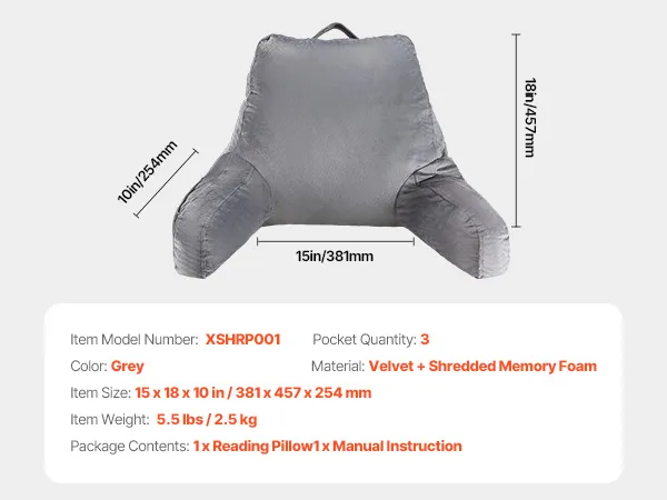 VEVOR Lesekissen Bettkissen in Standardgröße mit geschreddertem Memory-Schaum, Rückenkissen mit 3 Taschen & waschbarem kurzem Samttuch, Oberseite mit Griff, zum Fernsehen Lesen Spielen Grau