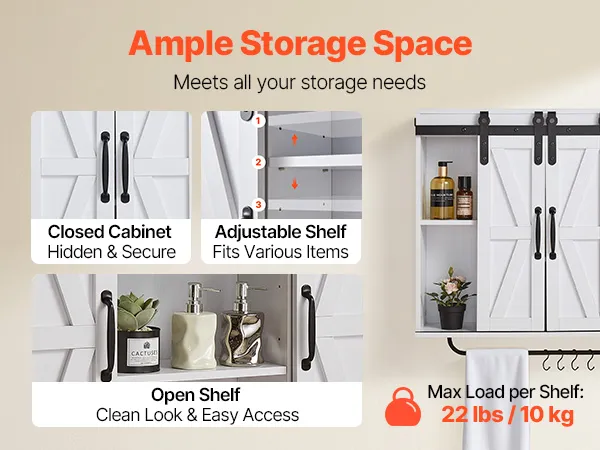 Der geschlossene Medizinschrank bietet versteckte, sichere Aufbewahrung für Gegenstände. Das verstellbare Regal des hängenden Badezimmerschranks lässt sich flexibel an verschiedene Arten von Gegenständen anpassen, und das offene Regal ist ordentlich und schön, um auf alltägliche Gegenstände zuzugreifen. Es ist robust und langlebig.