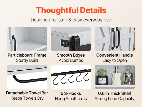 Unser wandmontierter Badezimmerschrank verfügt über einen robusten und langlebigen Spanplattenrahmen mit leichtgängigem Magnetverschluss. Praktische Griffe und glatte Kanten erleichtern das Öffnen und verhindern Stöße. Der abnehmbare Handtuchhalter mit 5 S-Haken zum einfachen Aufhängen kleiner Gegenstände sorgt für Sauberkeit.