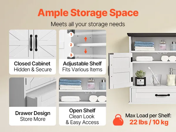 Das geschlossene Schrank- und Schubladendesign bietet versteckte, sichere Aufbewahrung für Gegenstände. Das verstellbare Regal des hängenden Badezimmerschranks lässt sich flexibel an verschiedene Arten von Gegenständen anpassen, und das offene Regal ist ordentlich und schön, um auf Alltagsgegenstände zuzugreifen. Es ist robust und langlebig.