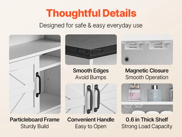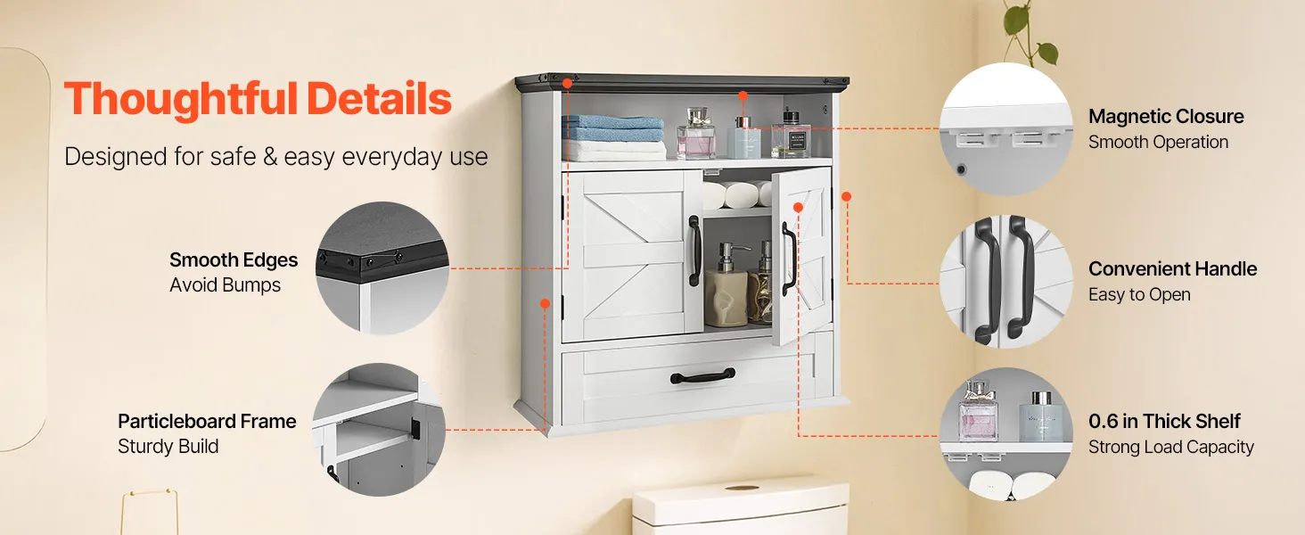 Unser wandmontierter Badezimmerschrank verfügt über einen robusten und langlebigen Spanplattenrahmen mit leichtgängigem Magnetverschluss. Praktische Griffe und glatte Kanten erleichtern das Öffnen und verhindern Stöße. Das 1,5 cm dicke Regal bietet hohe Tragkraft und bleibt langfristig stabil und attraktiv.