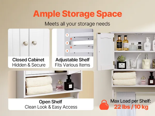 Der geschlossene Medizinschrank bietet versteckte, sichere Aufbewahrung für Gegenstände. Das verstellbare Regal des hängenden Badezimmerschranks lässt sich flexibel an verschiedene Arten von Gegenständen anpassen, und das offene Regal ist ordentlich und schön, um auf alltägliche Gegenstände zuzugreifen. Es ist robust und langlebig.