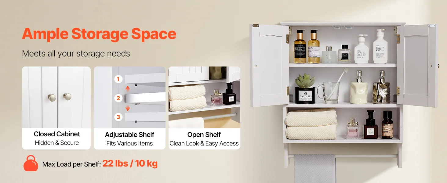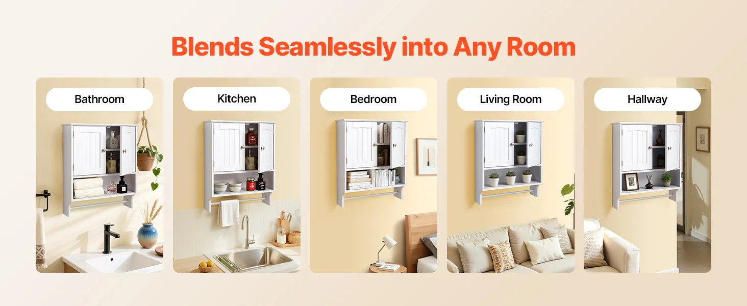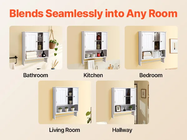 Dieser multifunktionale Badezimmer-Wandschrank fügt sich nahtlos in Badezimmer, Küchen, Schlafzimmer, Wohnzimmer, Flure und andere Wohnräume ein. Er lässt sich flexibel zur Aufbewahrung von Toilettenartikeln, Küchenutensilien, zum Ordnen von Unordnung im Schlafzimmer oder zur Dekoration von Wohnzimmerwänden anpassen.