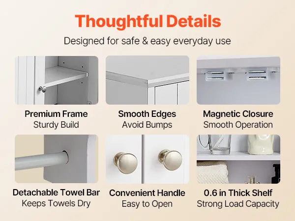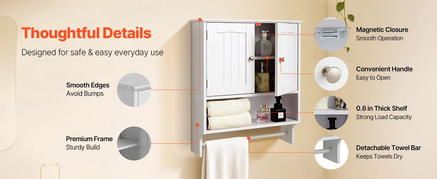Unser wandmontierter Badezimmerschrank verfügt über einen robusten und langlebigen Spanplattenrahmen mit leichtgängigem Magnetverschluss. Praktische Griffe und glatte Kanten erleichtern das Öffnen und verhindern Stöße. Der abnehmbare Handtuchhalter sorgt für Sauberkeit, ist praktisch und menschlich.