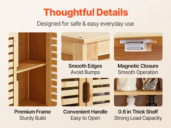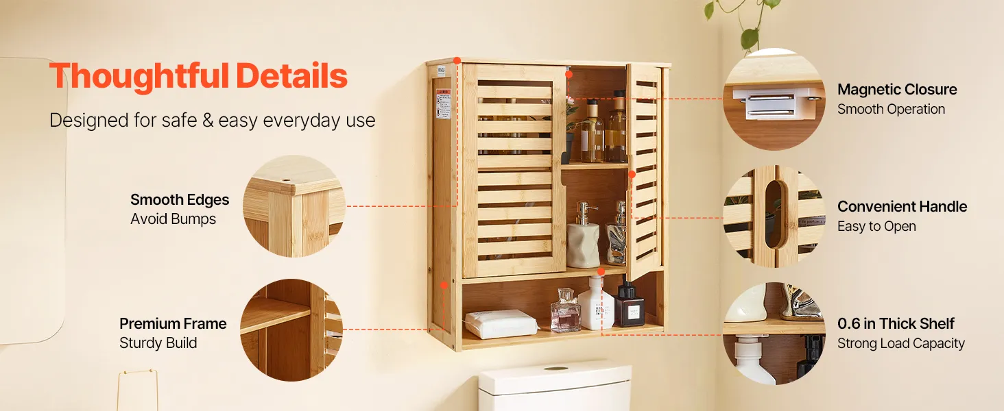 Unser wandmontierter Badezimmerschrank verfügt über einen robusten und langlebigen Rahmen mit leichtgängigem Magnetverschluss. Praktische Griffe und glatte Kanten erleichtern das Öffnen und verhindern Stöße. Das 0,6 Zoll dicke Regal bietet hohe Tragkraft und bleibt langfristig stabil und attraktiv.
