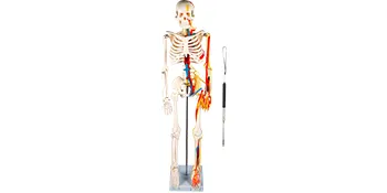 Es handelt sich um ein hochwertiges Skelettmodell mit Nerven, Venen und Arterien auf einer Hälfte und einem in der Brusthöhle angebrachten Herz.