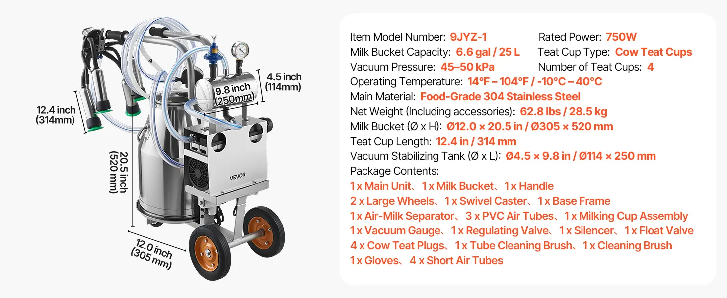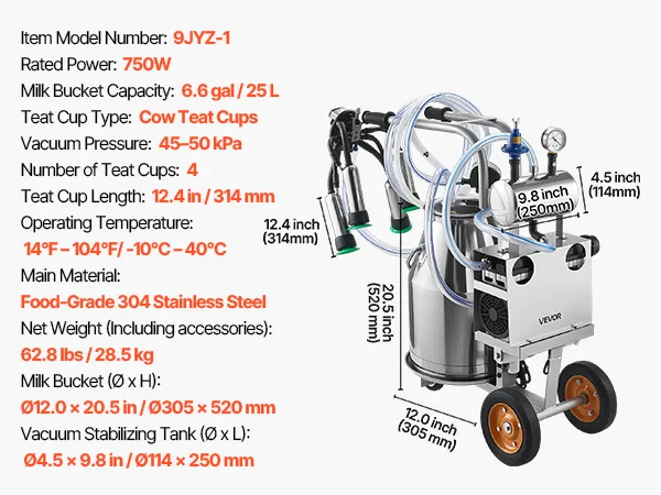 Food-Grade Materials You Can Trust: This electric milking machine for cow features a 6.6-gallon / 25L food-grade 304 stainless steel milk bucket and food-grade silicone hoses, helping keep milk clean and pure