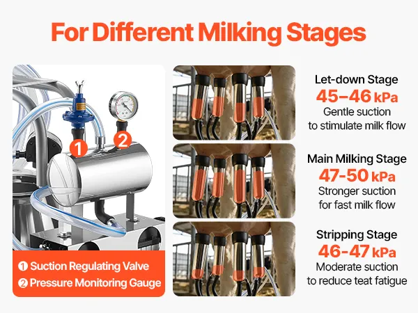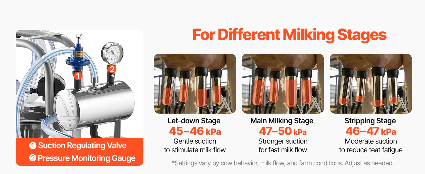 Faster Milking Efficiency: Equipped with an upgraded 900W vacuum pump, this electric cow milking machine delivers strong, stable suction for faster milking. The adjustable 45-50 kPa vacuum level supports flexible control across different milking stages.