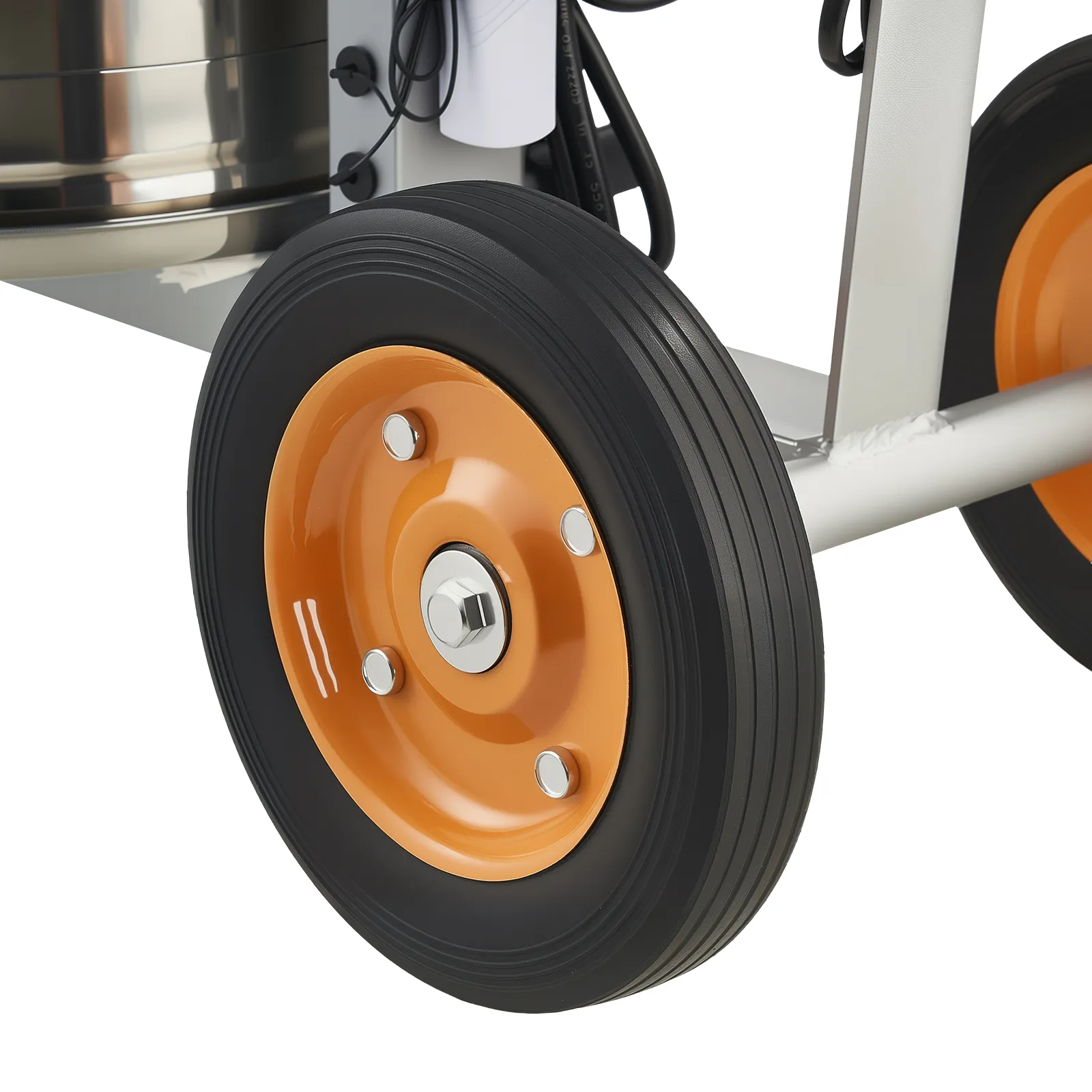 The smooth-roll, tri-wheel design allows the cow milker machine to move easily across barns and farm terrain.