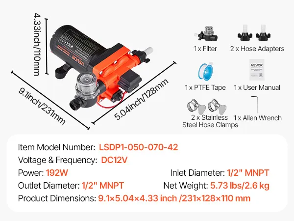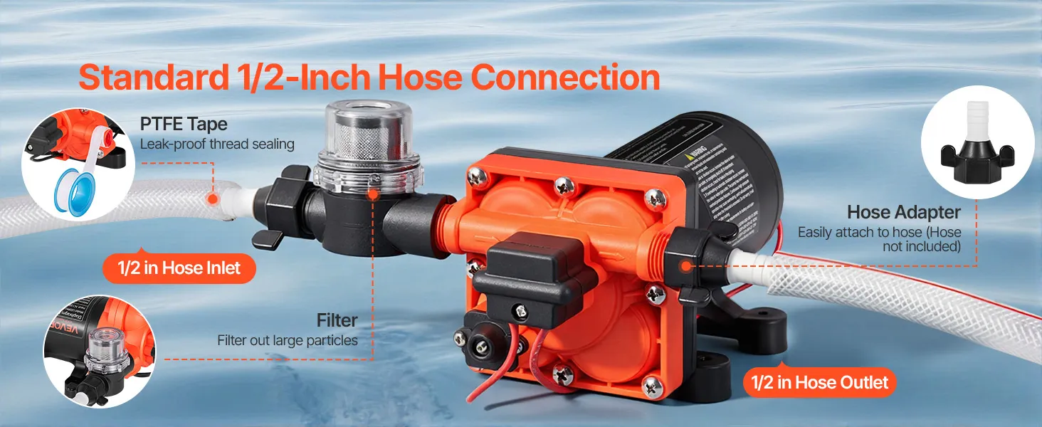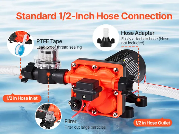 1/2-Zoll-Schlauchanschluss: Ausgestattet mit einem Schlauchadapter lässt sich unsere Membranpumpe schnell an jeden Standard-1/2-Zoll-Schlauch anschließen. Edelstahlklemmen verstärken die Verbindung, PTFE-Band verbessert die Gewindeabdichtung, um Leckagen zu vermeiden, und der Filter blockiert grobe Ablagerungen
