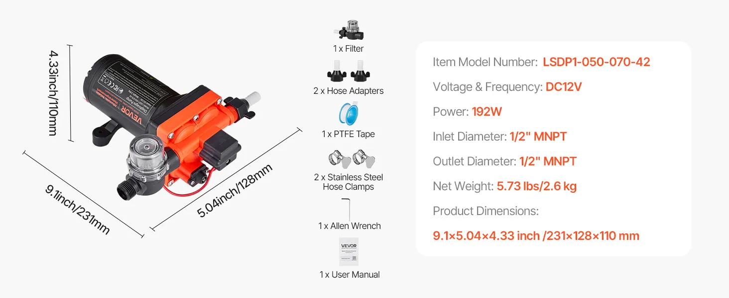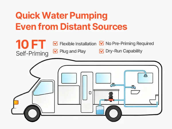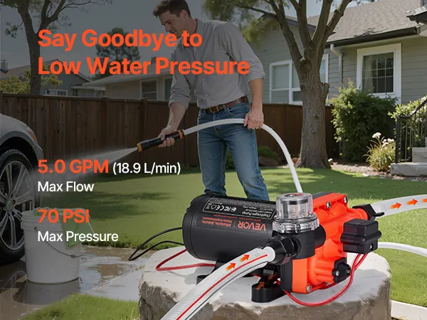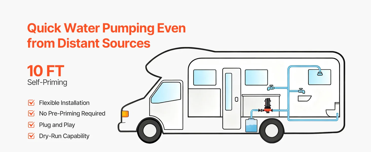 Hochleistungspumpe mit 5 GPM (18,9 L/min): Unsere leistungsstarke 12-V-Membranpumpe liefert einen maximalen Durchfluss von 5 GPM (18,9 L/min), einen maximalen Druck von 70 PSI (4,8 bar) und eine selbstansaugende Höhe von 10 Fuß (3 m). Schnelles Ansaugen von Wasser aus entfernten Tanks ohne Vorfüllen – unterstützt kurze Trockenstarts