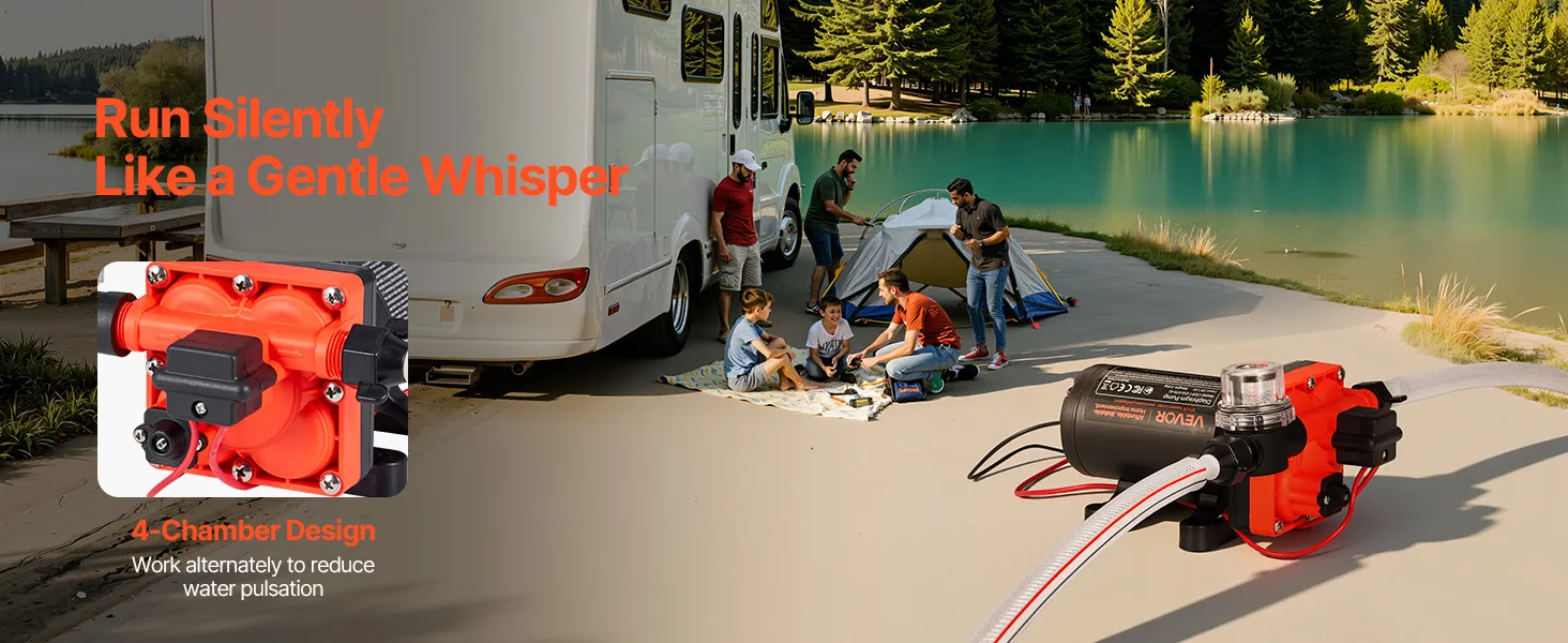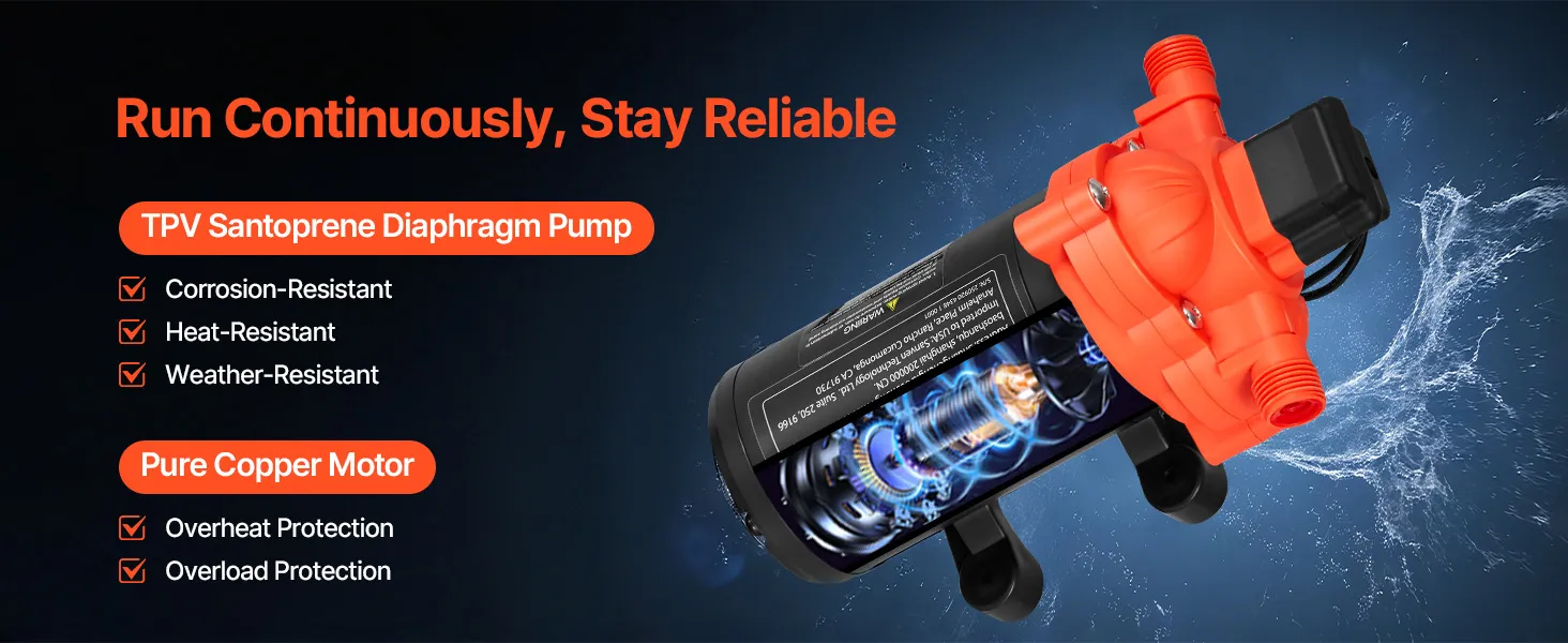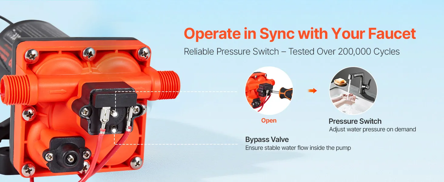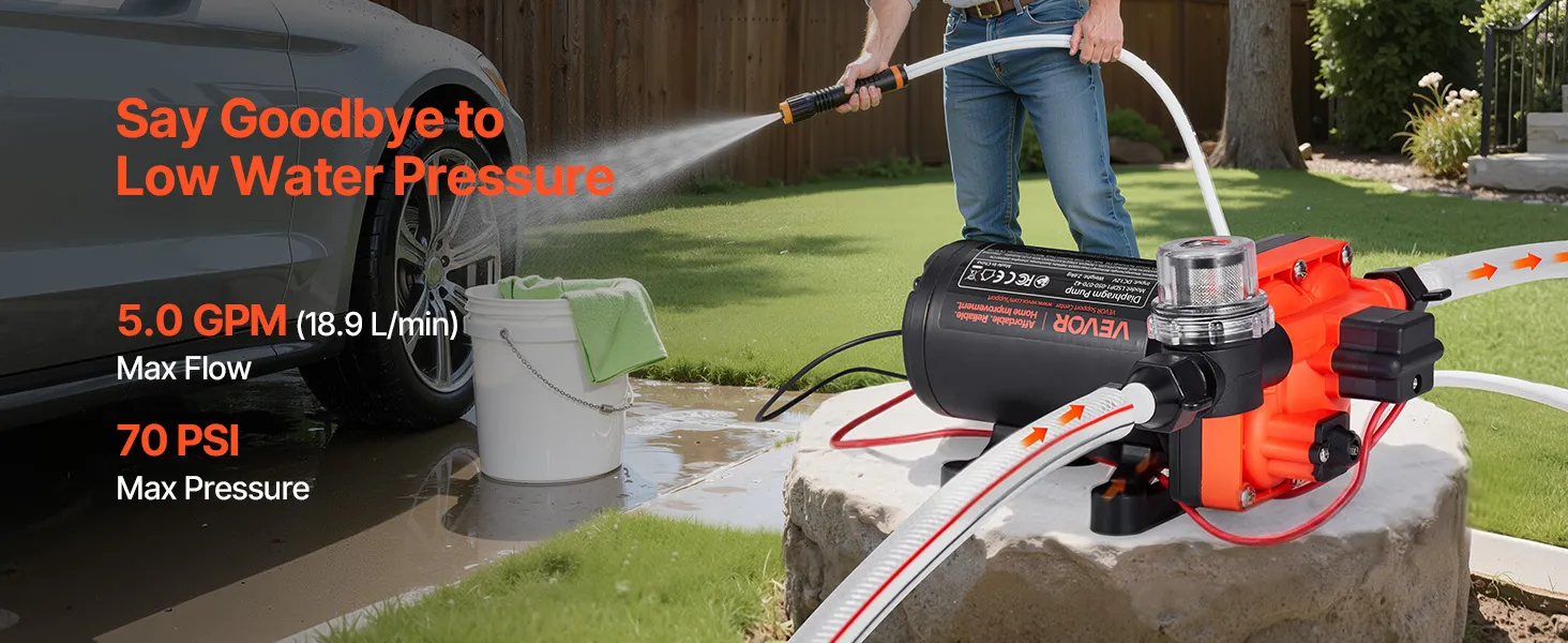 Vielseitig einsetzbar: Langlebig und mit Überhitzungs- und Überlastungsschutz ausgestattet. Unsere bedarfsgesteuerte Membranwasserpumpe ist ideal für Wohnmobile, Camper, Imbisswagen, Gartenbewässerung, Sprinkler, Regenwasserfässer usw. Hinweis: Nicht wasserdicht, nicht für den Außenbereich geeignet