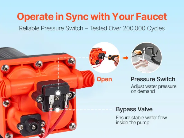 Automatischer Start & Stopp: Mit einem über 200.000 Zyklen getesteten Druckschalter und einem Bypassventil. Öffnen Sie den Wasserhahn und die Wasserpumpe startet automatisch. Schließen Sie ihn und die Pumpe stoppt sofort. Sie können den Wasserdruck auch mit einem Inbusschlüssel einstellen.
