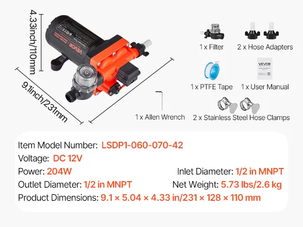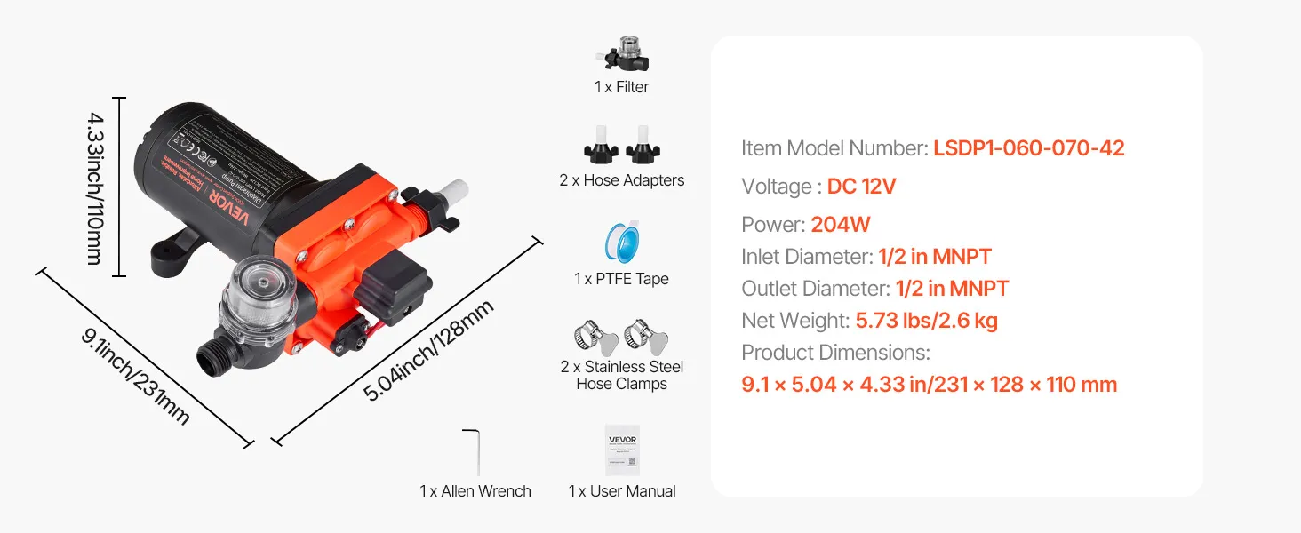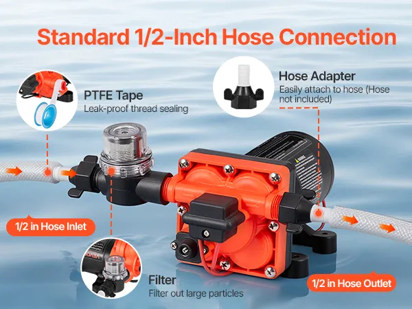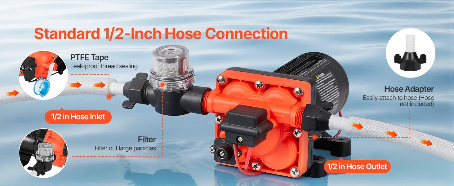 1/2-Zoll-Schlauchanschluss: Ausgestattet mit einem Schlauchadapter lässt sich unsere Membranpumpe schnell an jeden Standard-1/2-Zoll-Schlauch anschließen. Edelstahlklemmen verstärken die Verbindung, PTFE-Band verbessert die Gewindeabdichtung, um Leckagen zu vermeiden, und der Filter blockiert grobe Ablagerungen