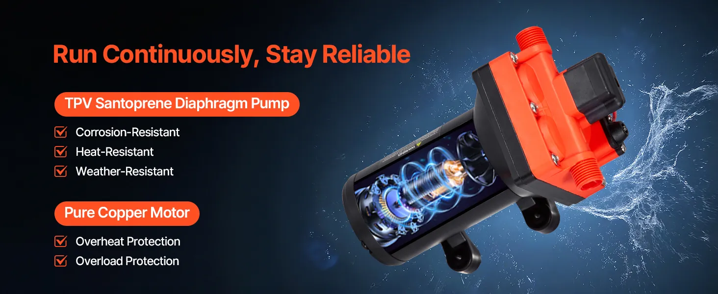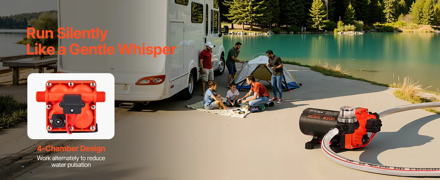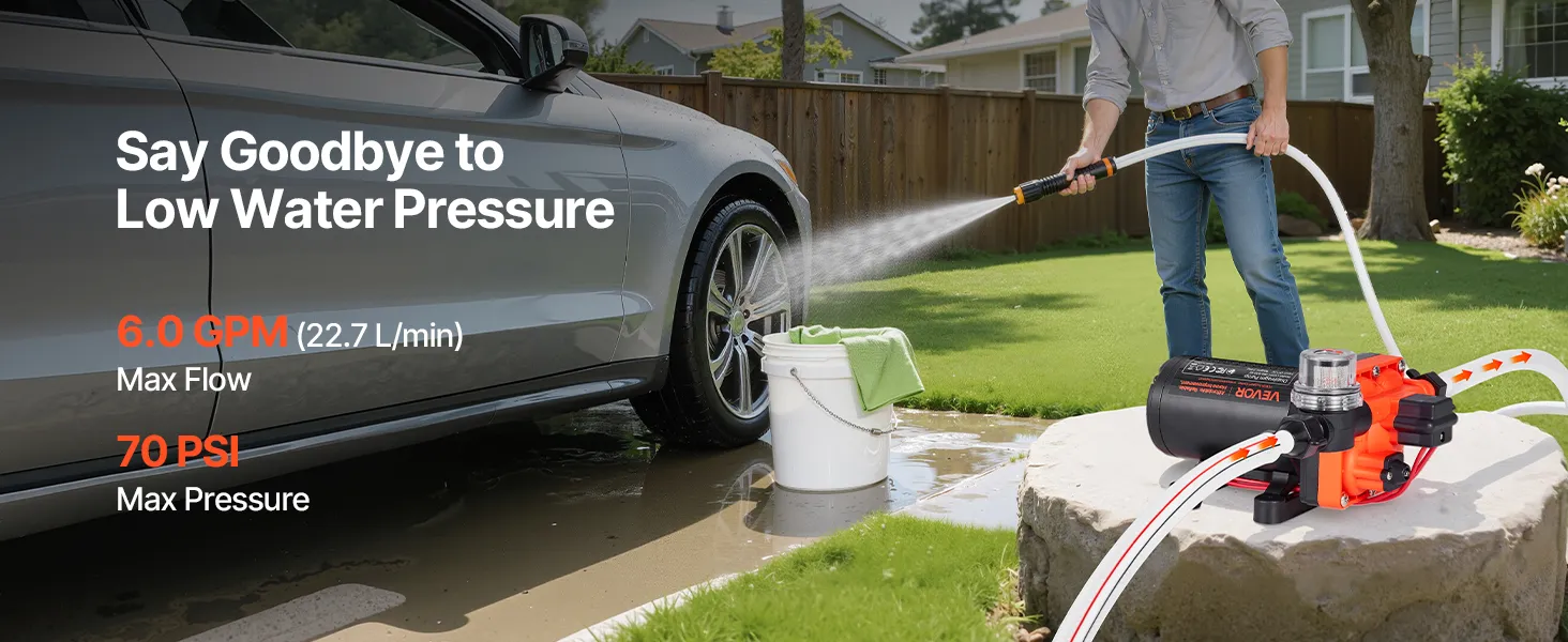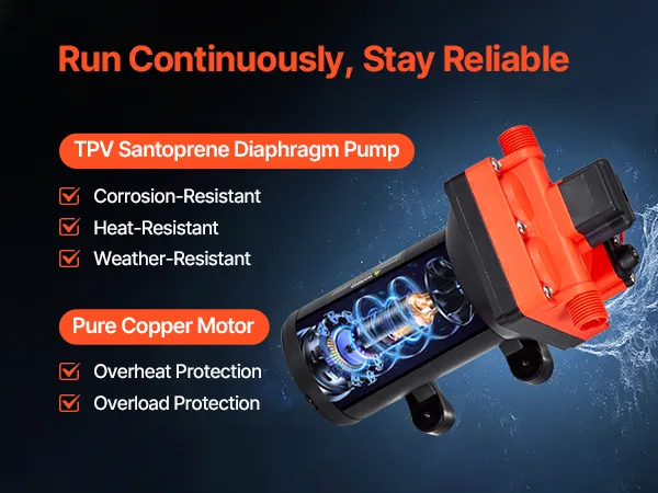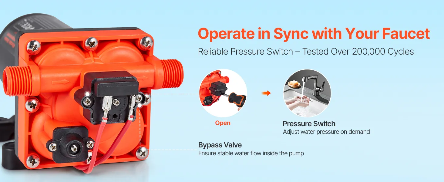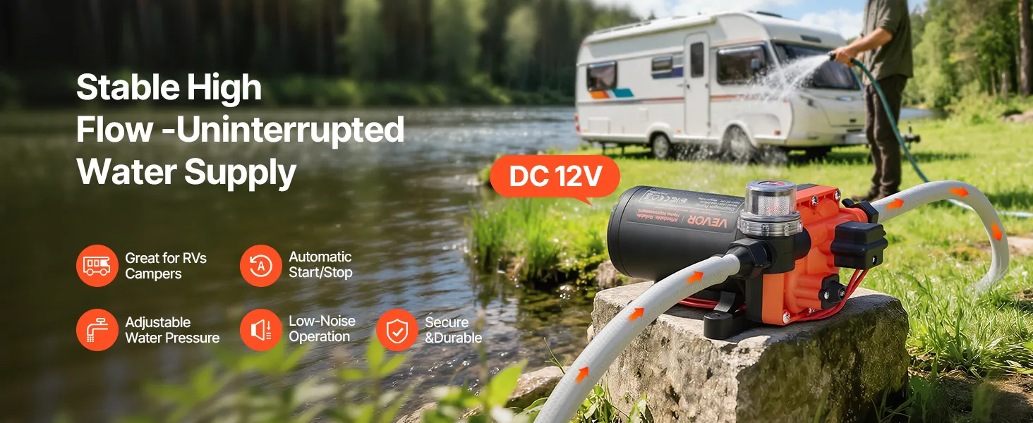 Vielseitig einsetzbar: Langlebig und mit Überhitzungs- und Überlastungsschutz ausgestattet. Unsere bedarfsgesteuerte Membranwasserpumpe ist ideal für Wohnmobile, Camper, Imbisswagen, Gartenbewässerung, Sprinkler, Regenwasserfässer usw. Hinweis: Nicht wasserdicht, nicht für den Außenbereich geeignet