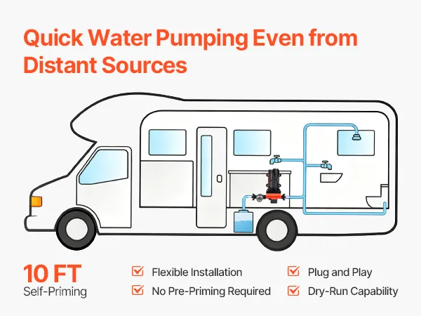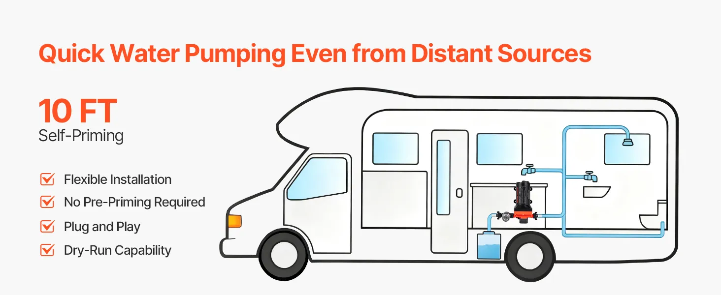 Hochleistungspumpe mit 6 GPM (22,7 L/min): Unsere leistungsstarke 12-V-Membranpumpe liefert einen maximalen Durchfluss von 6 GPM (22,7 L/min), einen maximalen Druck von 70 PSI (4,8 bar) und eine selbstansaugende Höhe von 10 Fuß (3 m). Schnelles Entnehmen von Wasser aus entfernten Tanks ohne Vorfüllen – unterstützt kurze Trockenstarts